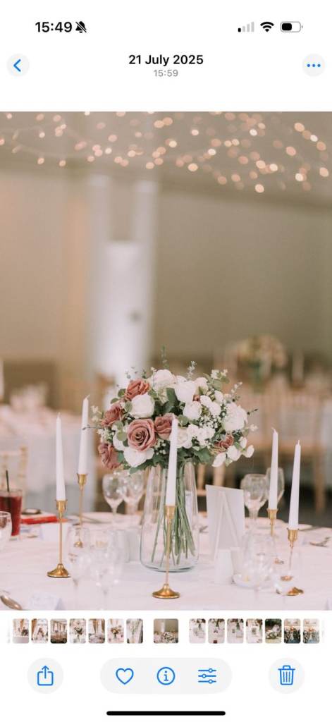 We have our beautiful wedding flowers for sale. They are artificial and come with the vases. There are 12 vases of flowers for £240 (£20 a centre piece - flowers and vase for each). Open to offers. Collection Edinburgh or can deliver locally if required.
