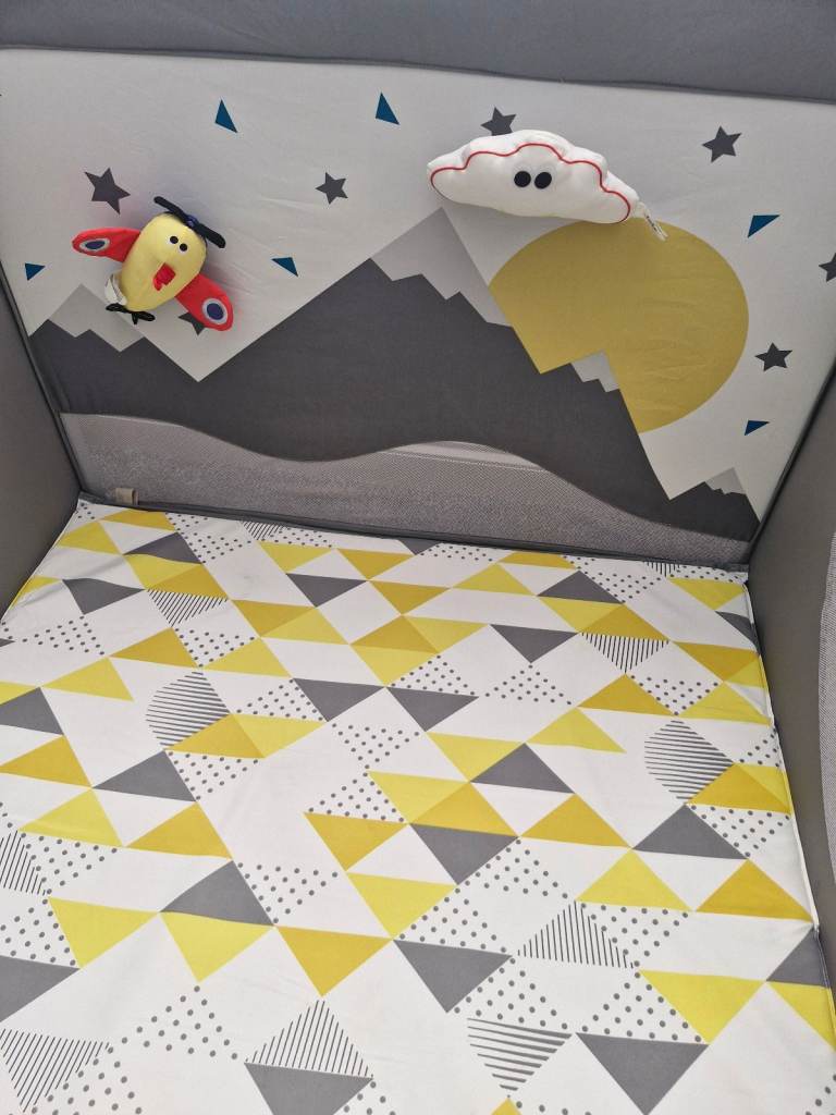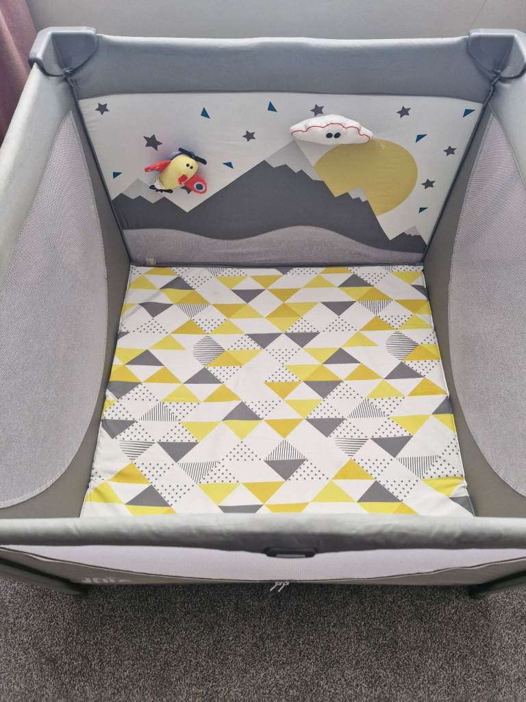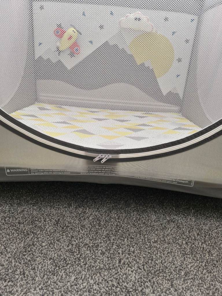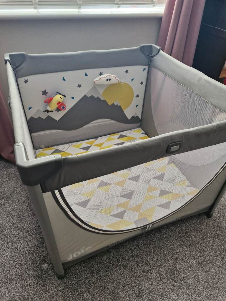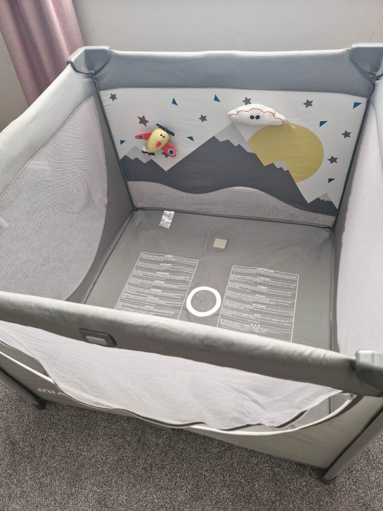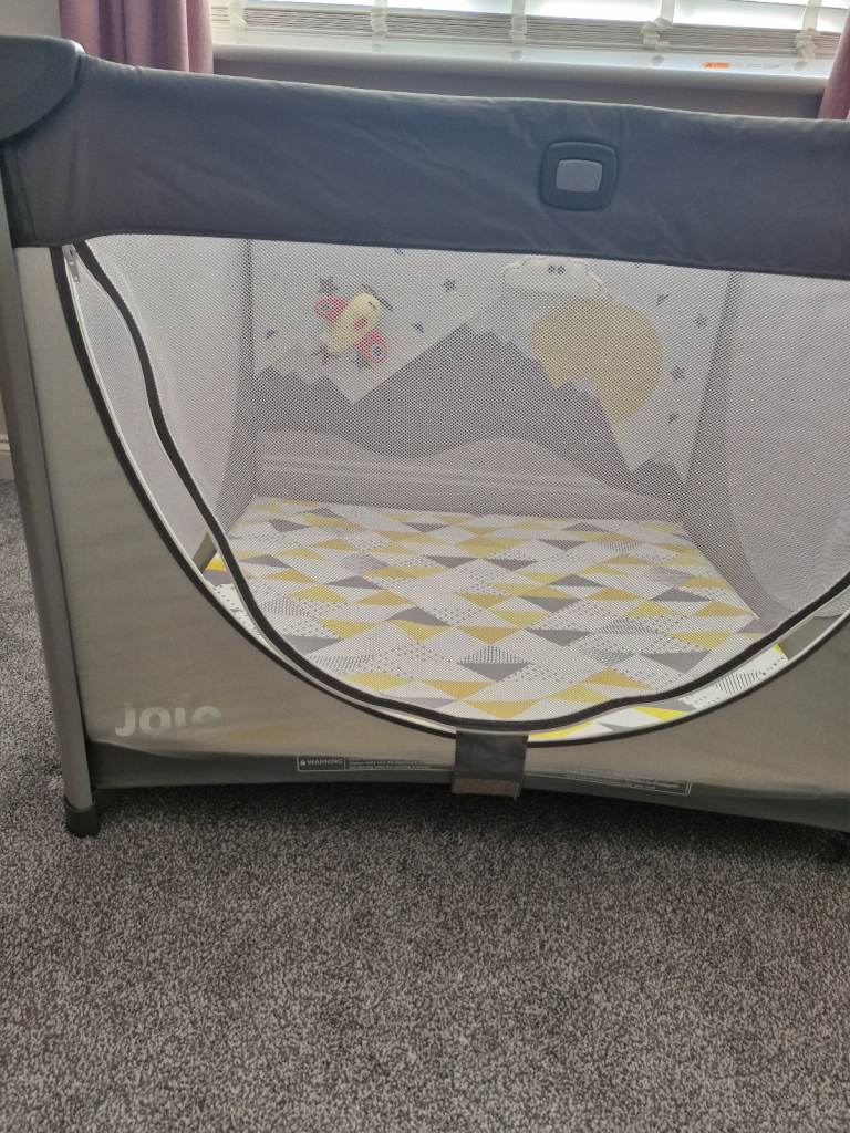 Joie playpen/travelcot. Measuring 150cm x 150cm, it's large enough for plenty of toys and room to move. Comes with 2 x velcro toys. The mesh side also has a zip. We've only used it indoors at home for around 6 months, and it's in excellent condition with no rips or tears. It's easily collapsible for storage or travel and comes with all original storage bag and instructions. Reduced from £40 to £30. It's still £95 in Argos.