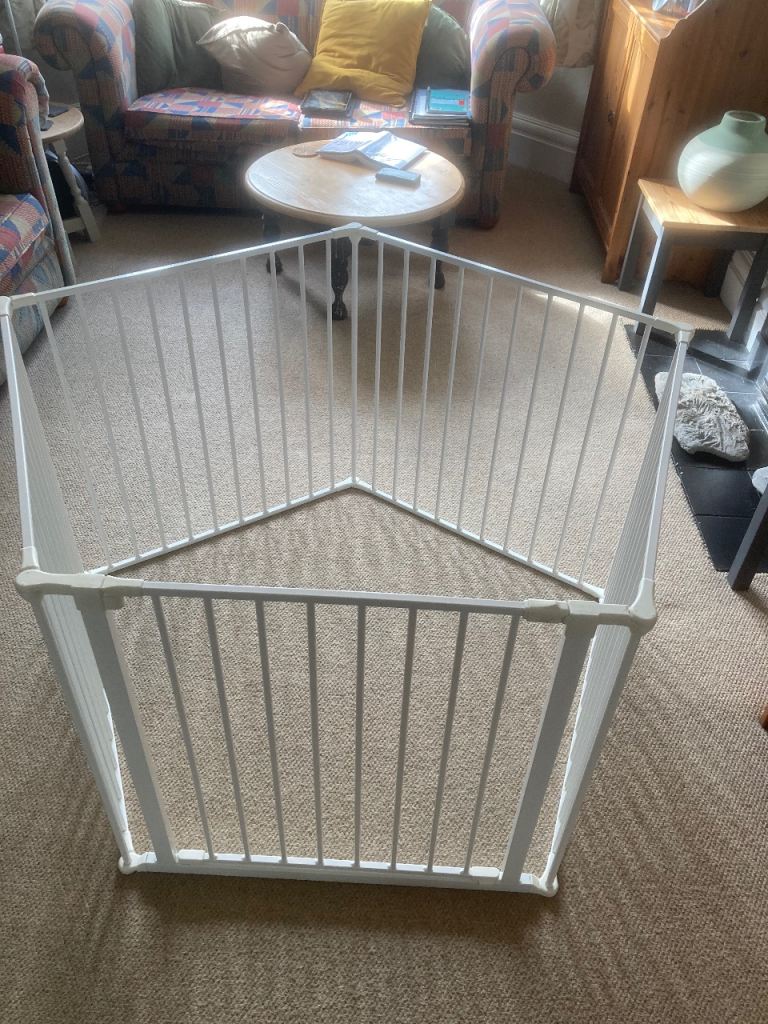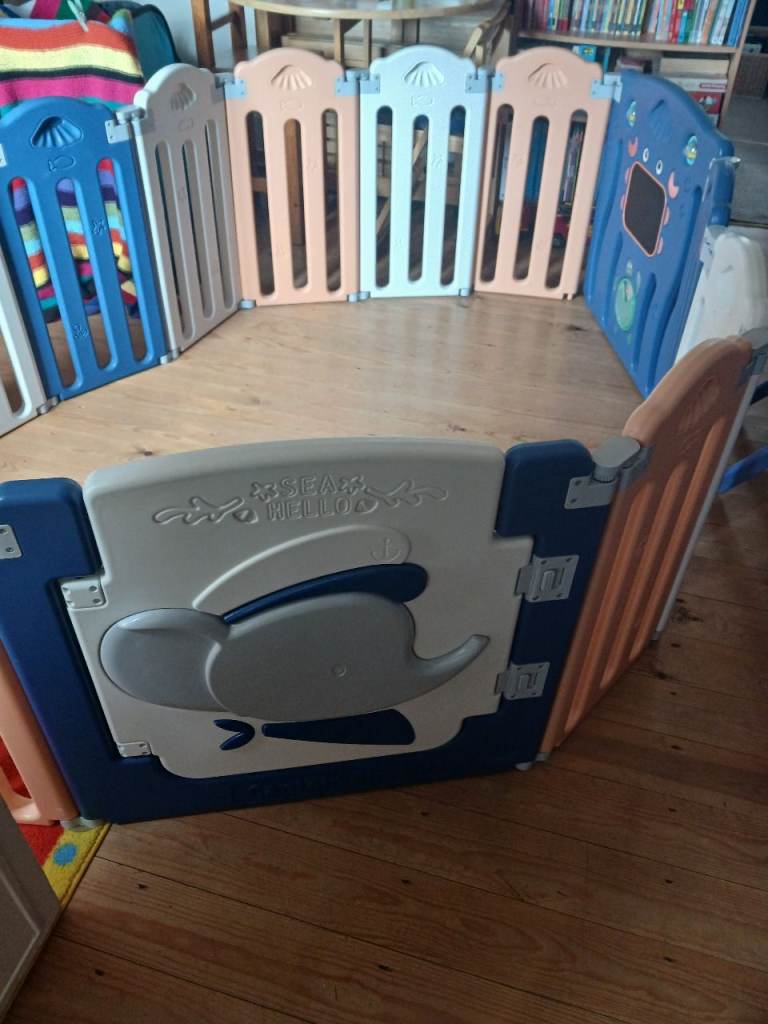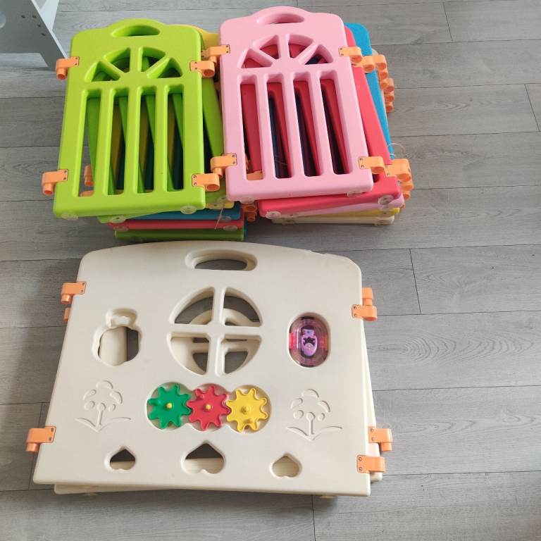 Solid plastic playpen, can be changed in size, image of set up is approx 210cm x 110cm, height is approx 59cm, good solid and safe pen for kids/pets.