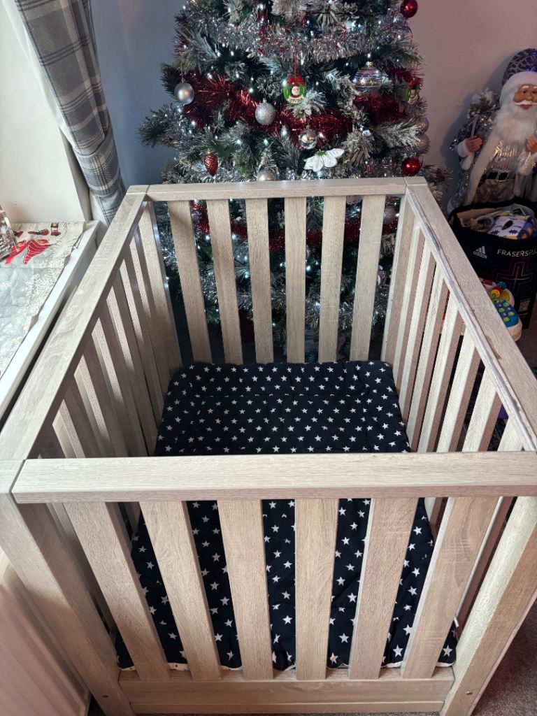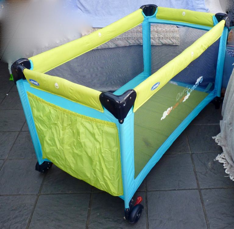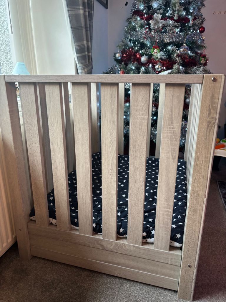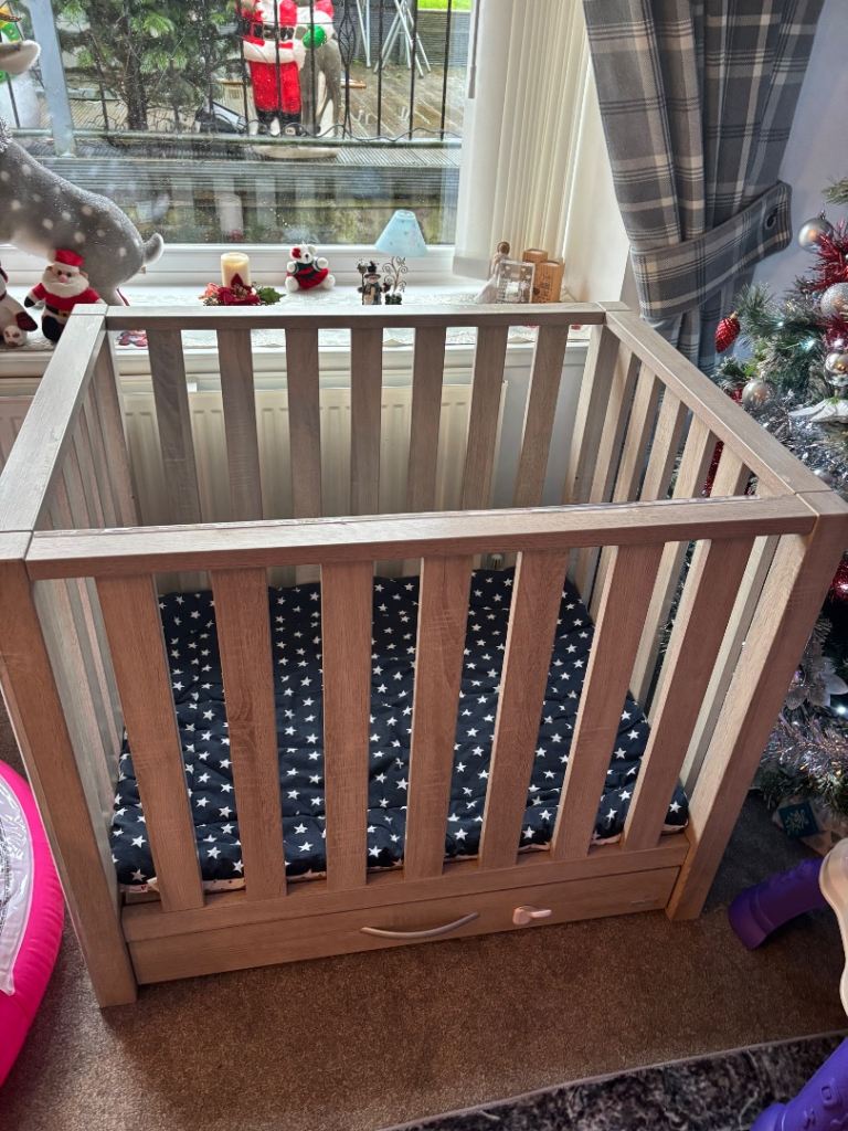 Compact wooden playpen, ideal for small areas. Has storage drawer underneath. Already dismantled