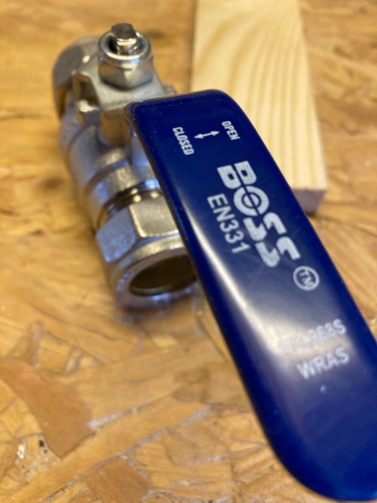 22mm lever ball valve with blue handle. Complete with brass olives. Chromed. NEW, unused. Make BOSS. See photos. Collection from Whitchurch BRISTOL.