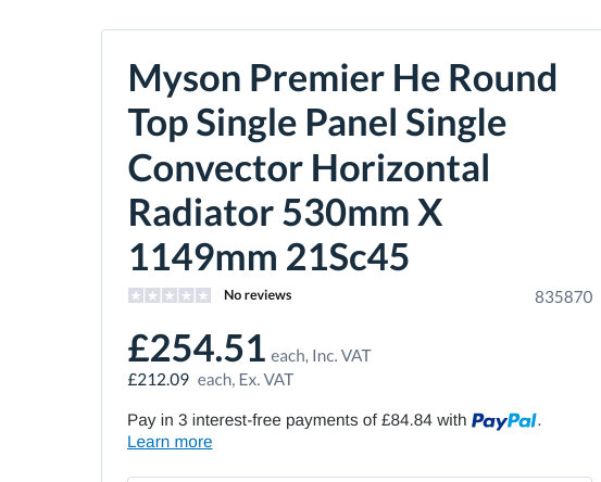 myson premier he, roundtop radiator, 1149 x 530mm single panel, new.