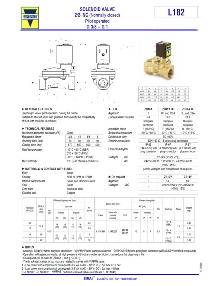 The Sirai L182D01-3/4-230/50 solenoid valve is a high-quality, 3/4" valve suitable for use with water, oil, gas, and air. This normally closed (NC) valve, made from brass, operates with a solenoid mechanism and can be powered by AC or DC currents. With a maximum pressure rating of 20bar and a 2-way valve operation, this brand valve is perfect for various industrial and commercial applications requiring reliable and efficient control of fluid flow.