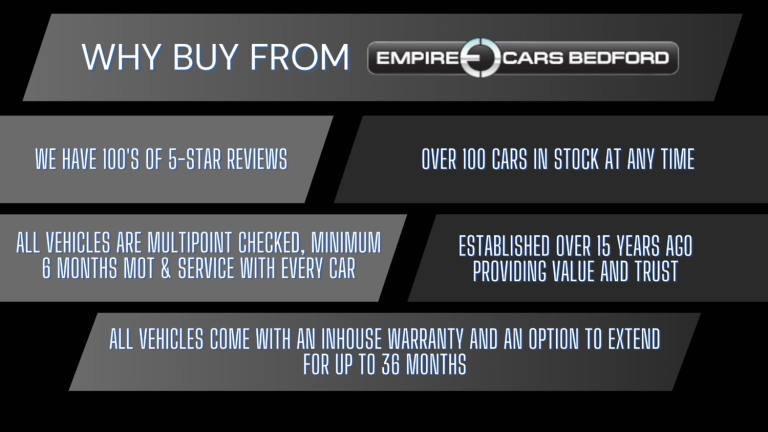 Empire Cars Bedford is a privately owned, family run business specialising in quality used car sales. Established since 2008 and known locally, we pride ourselves on our helpful, friendly sales and after sales service. Whether you are buying a quality used car or looking to service or MOT your existing car, why not call us today to find out how we can help you.