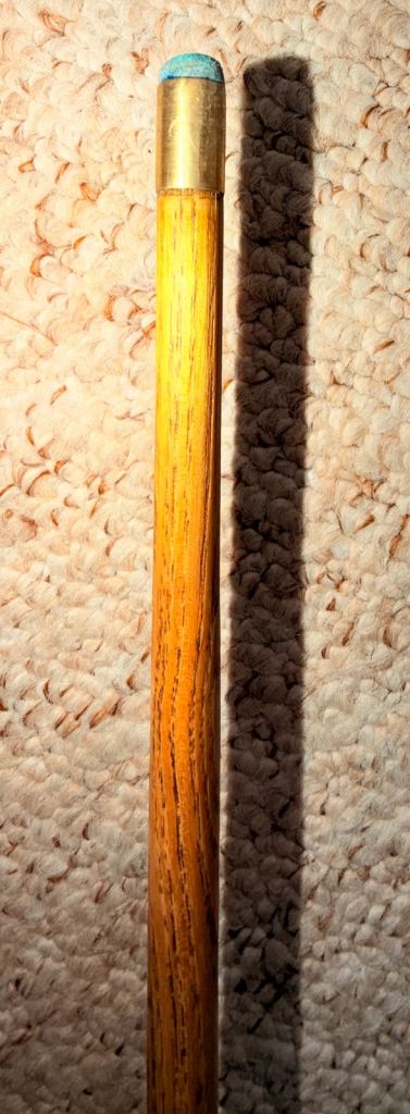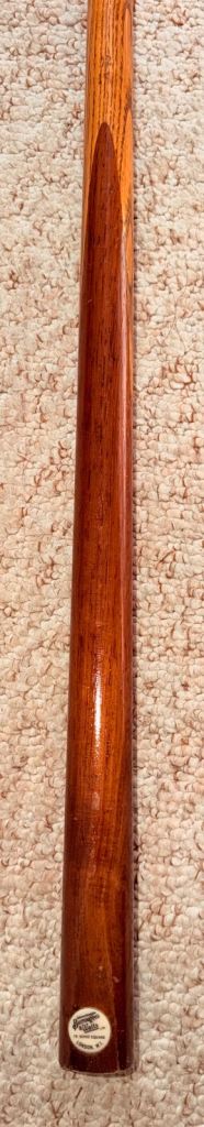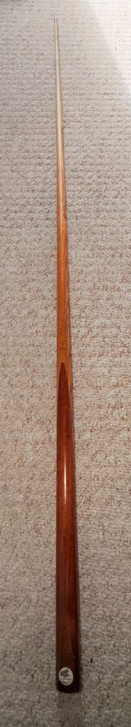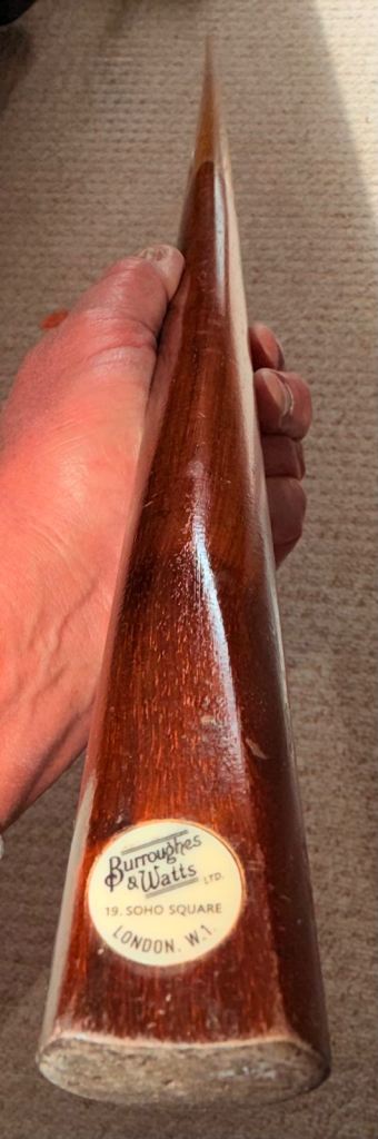 Vintage and original one-piece snooker cue. Hand-spliced, made by Burroughes & Watts of London. Nice and straight cue, weight 15.5oz, length 57 inches and 9.5mm tip. Plays beautifully.
