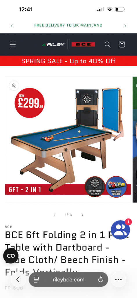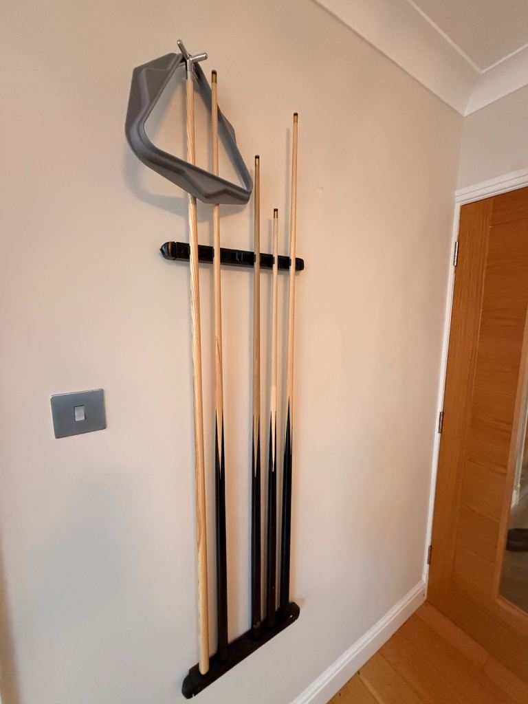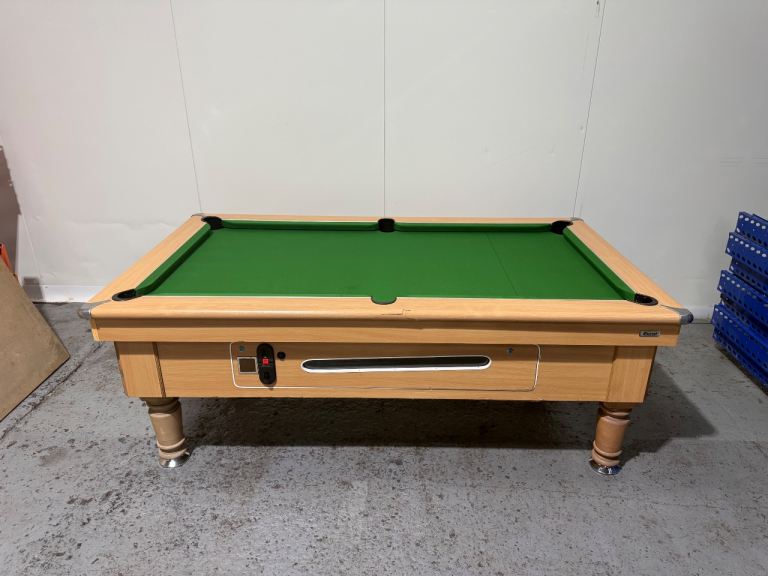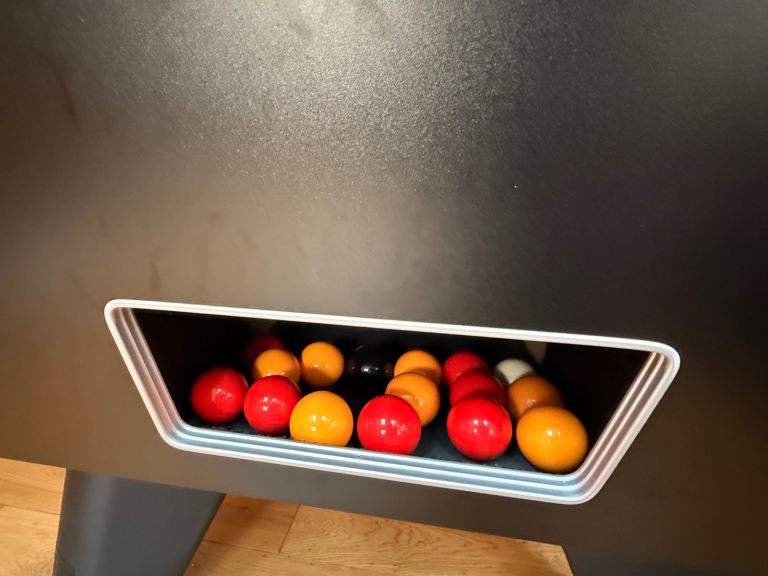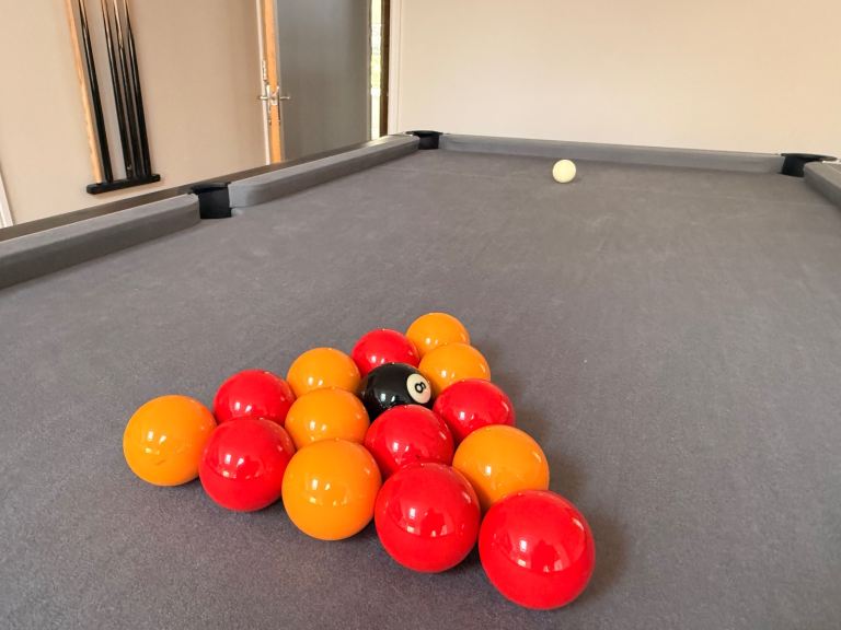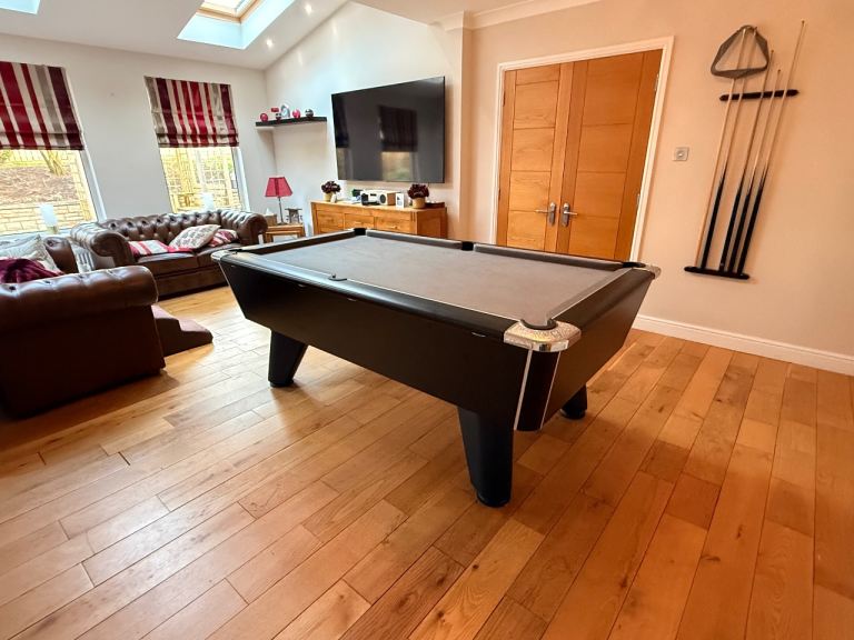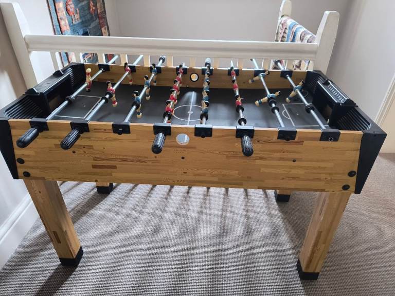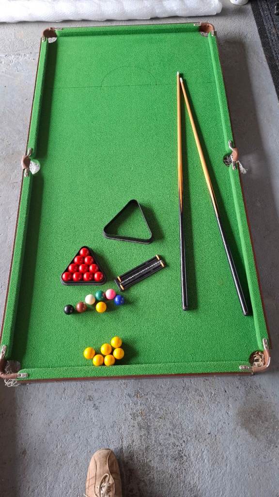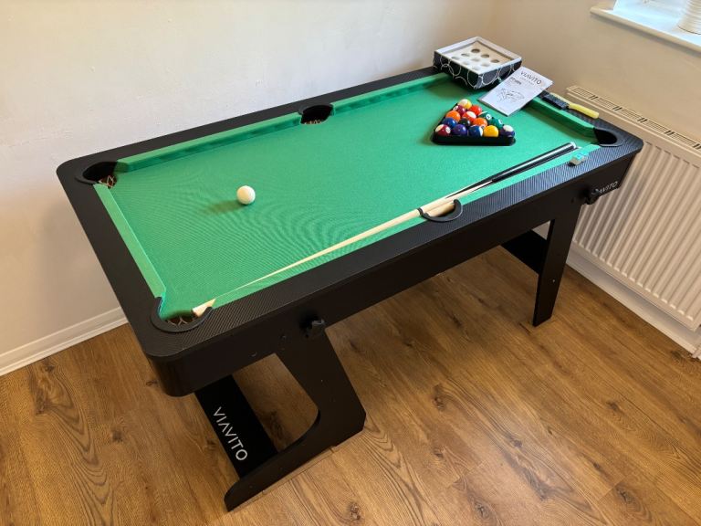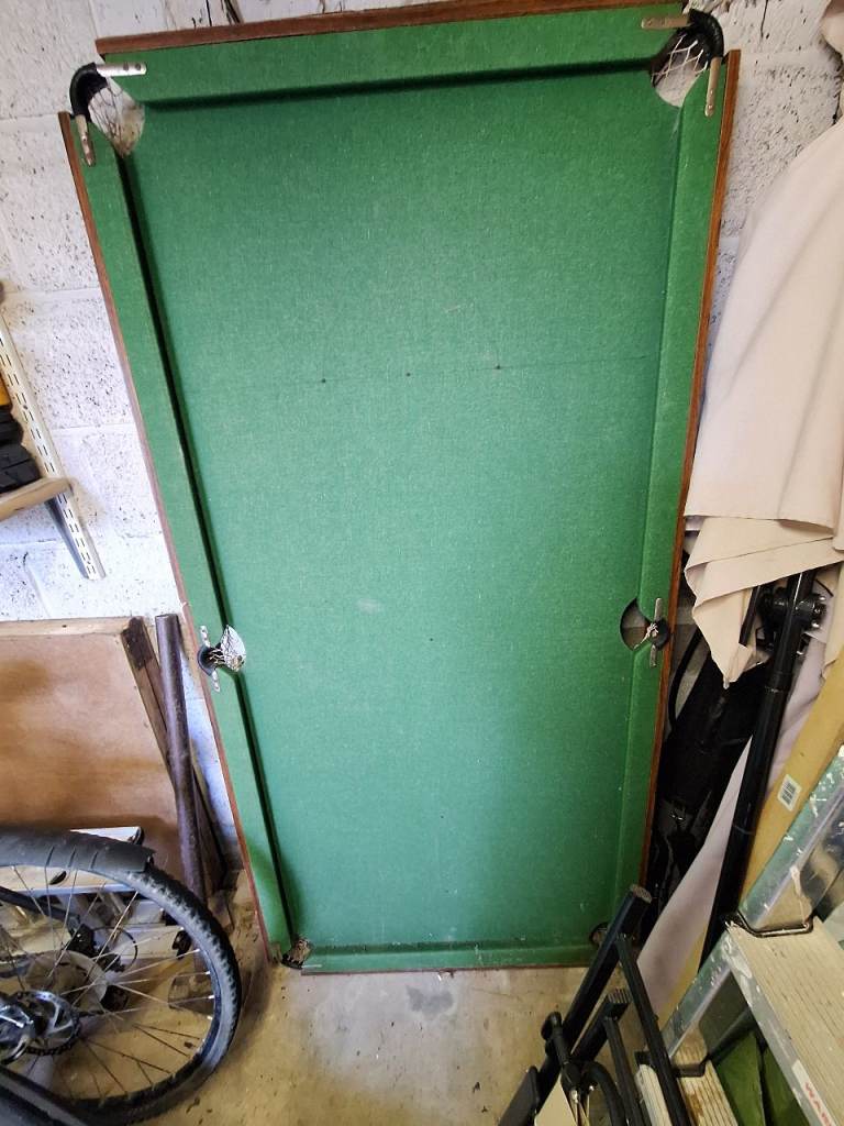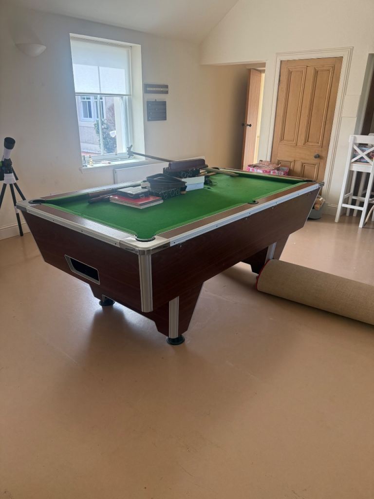 In perfect condition. Bought a year ago and now moved house so can’t fit it properly in new room. Grey cloth. Comes with set of balls, cues, cue rack and table tennis top, bats and nets etc.