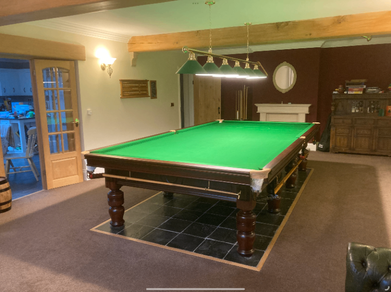 Fully refurbished BCE Westbury snooker table. As used in all World completions during 80’’s and early 90’s. Fitted with steel block cushions, brand new cushion friezes. New nets, leathers, tournament rails. Fitted with Strachan Superfine cloth. Includes playing accessories.