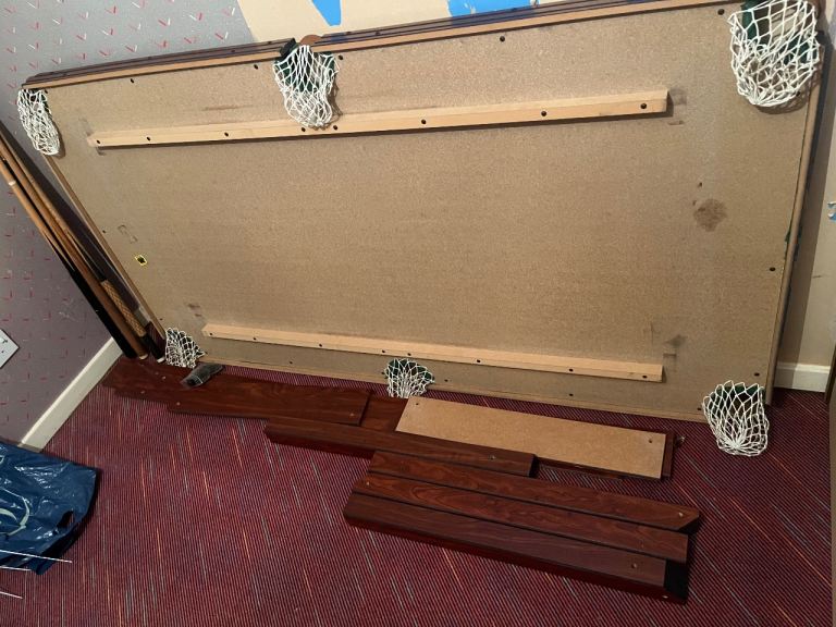 Full size uk regulations pool table, perfect condition. No scuffs on cloth. With pool and snooker balls, cues, rest, brush,chalk. Stored flat, just recently been dismantled. Buyer to collect. Its heavy. £50 ono