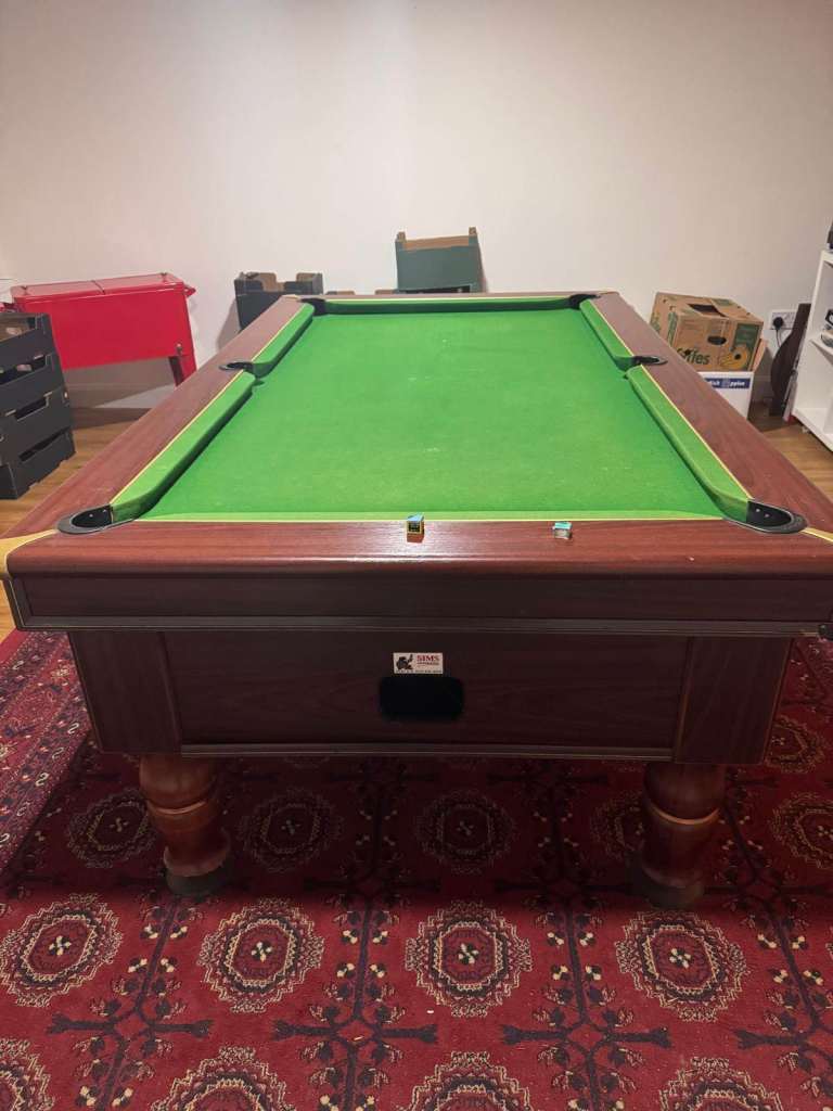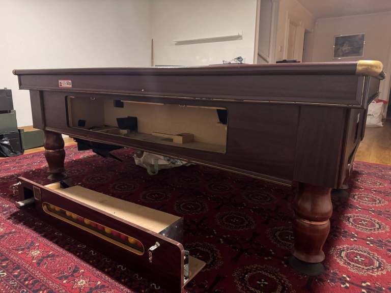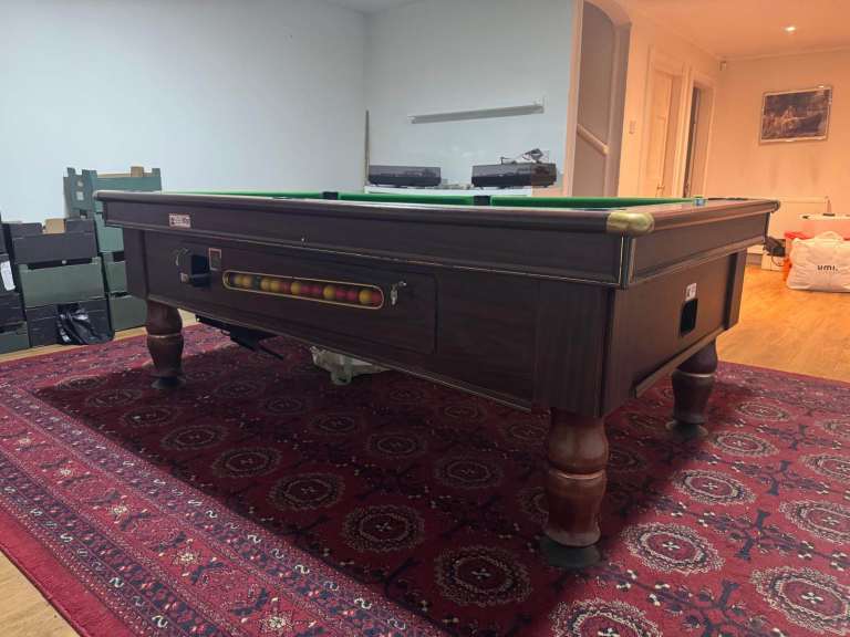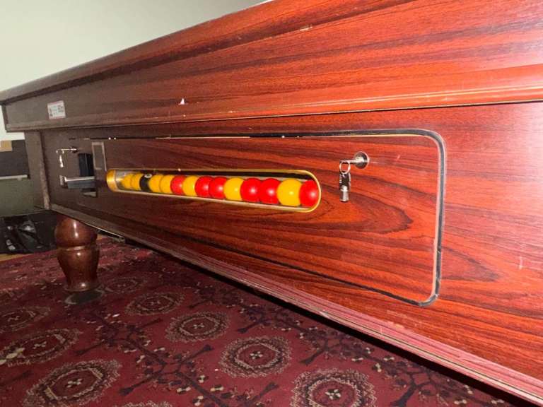 Fully operational competition slate bed pool table. The table comes with full set of balls and cues. The table is coin operated with safe box underneath. It has been well maintained. The felt is in good condition, pockets all work.