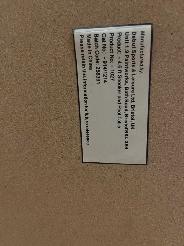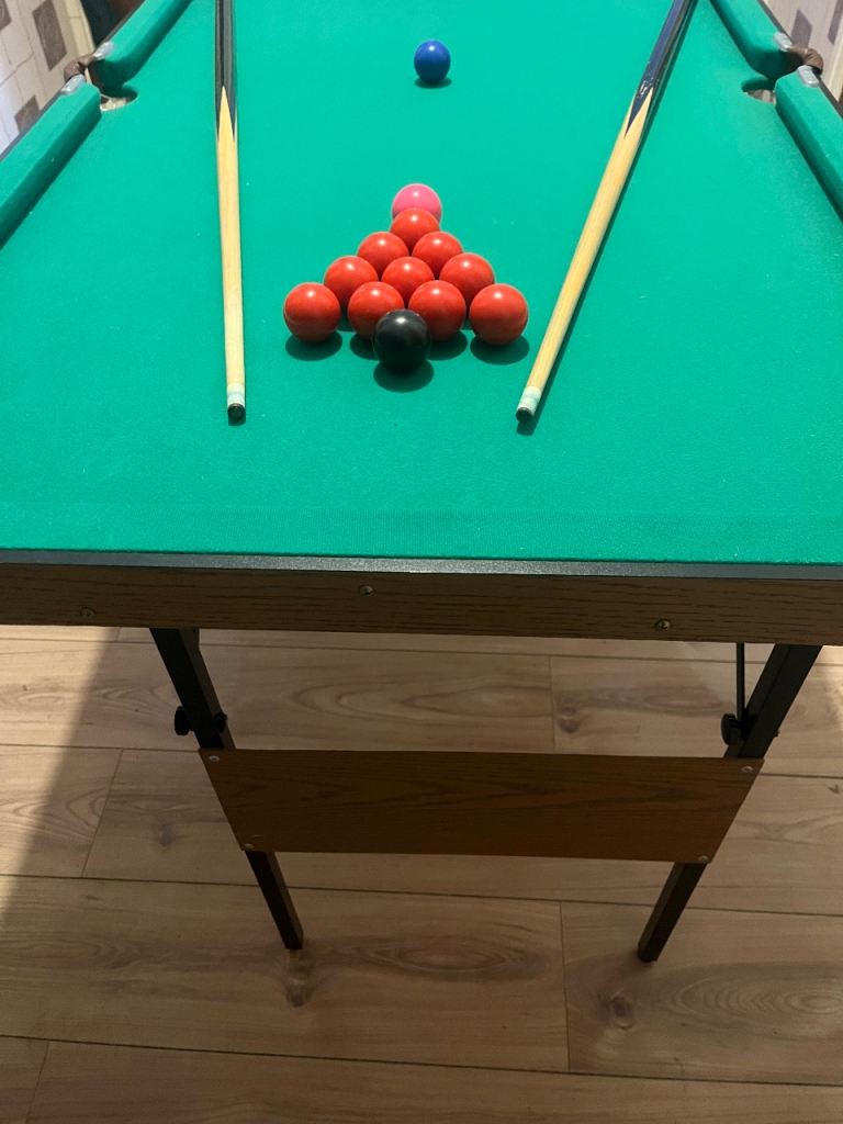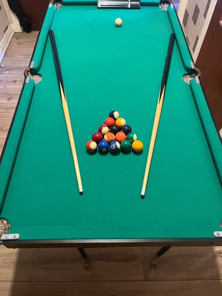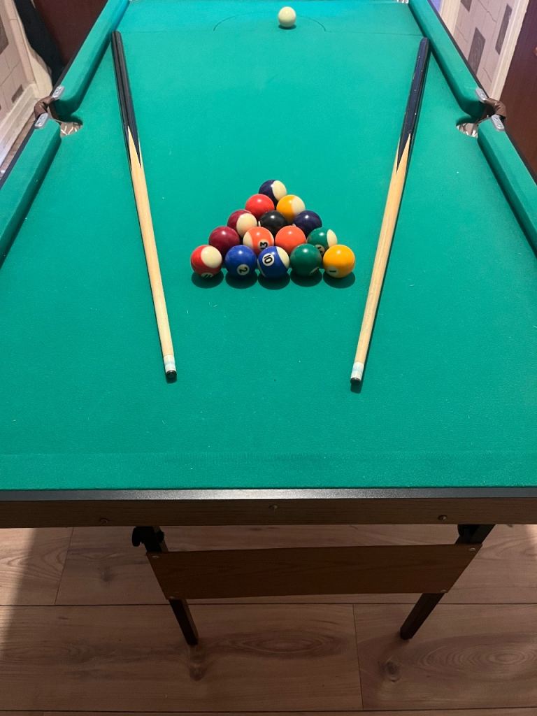 4 foot 6 foldable, Hardly used, pockets and baize immaculate, all balls. Missing triangle is only negative. Less than half price. Norton collection.