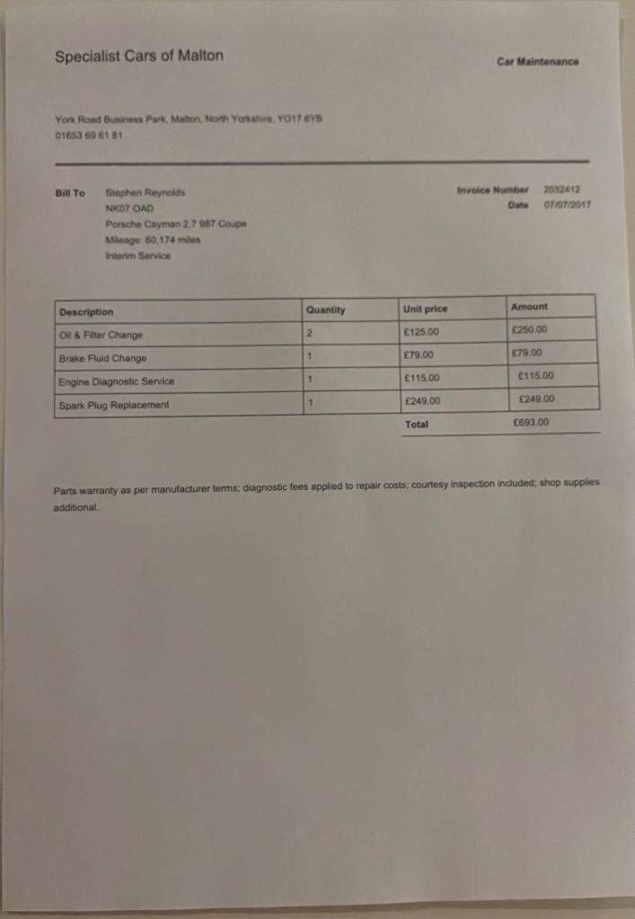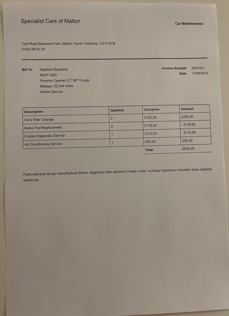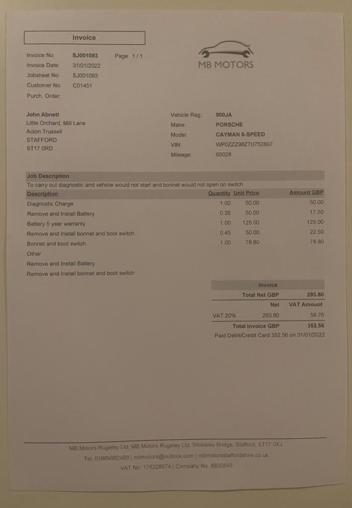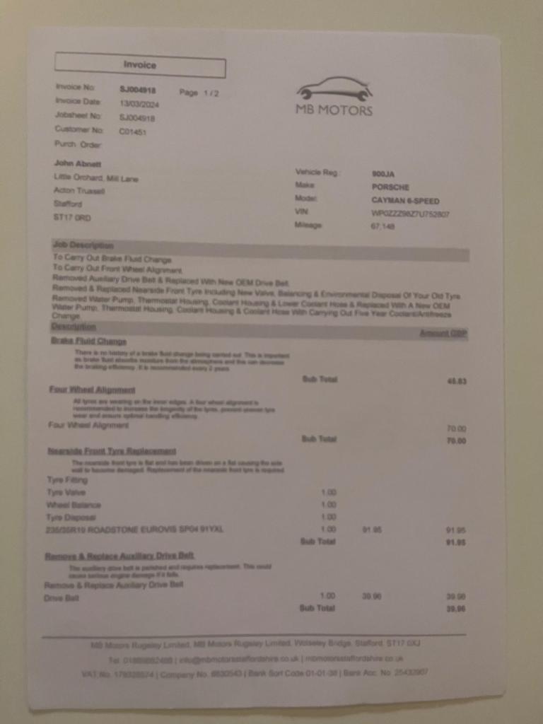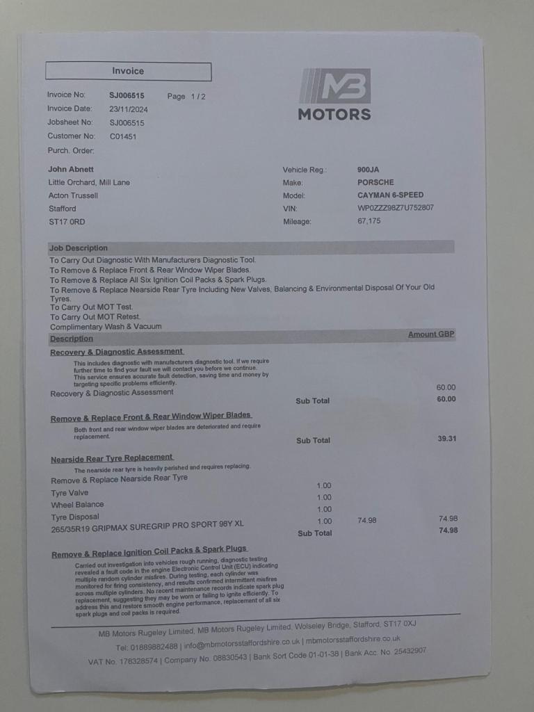 Registration for this car is NK07 OADThis 2007 Porsche Cayman 987 boasts a full service history, with its last service completed on 23 November 2024 at 67,175 miles, and a clear vehicle history check for your peace of mind. This 2.7 litre petrol model comes with a 3 month warranty and its MOT is valid until November 2026. Inside, you'll find a 3 spoke multi function steering wheel finished in leather and practical floor mats.This Porsche Cayman offers excellent value, indicated by its low insurance group and an impressive fuel economy of 30 mpg. Furthermore, its low CO2 emissions mean it is more environmentally considerate than many comparable vehicles.Supplied New by Porsche Centre Solihull9 Main Services HistoryService @ 20/02/2009 with 13,562 miles @ Porsche NewcastleService @ 11/02/2011 with 28,366 miles @ Porsche NewcastleService @ 16/03/2013 with 46,227 miles @ Porsche NewcastleService @ 17/03/2015 with 52,344 miles @ Specialist Cars of MaltonService @ 07/07/2017 with 60,174 miles @ Specialist Cars of MaltonService @ 28/06/2021 with 64,372 miles @ MB Motors RugeleyService @ 31/01/2022 with 65,028 miles @ MB Motors RugeleyService @ 13/03/2024 with 67,148 miles @ MB Motors RugeleyService @ 23/11/2024 with 67,175 miles @MB Motors RugeleyPlease find the following video weblinks helpful to make an informed decision;[Website URL removed]