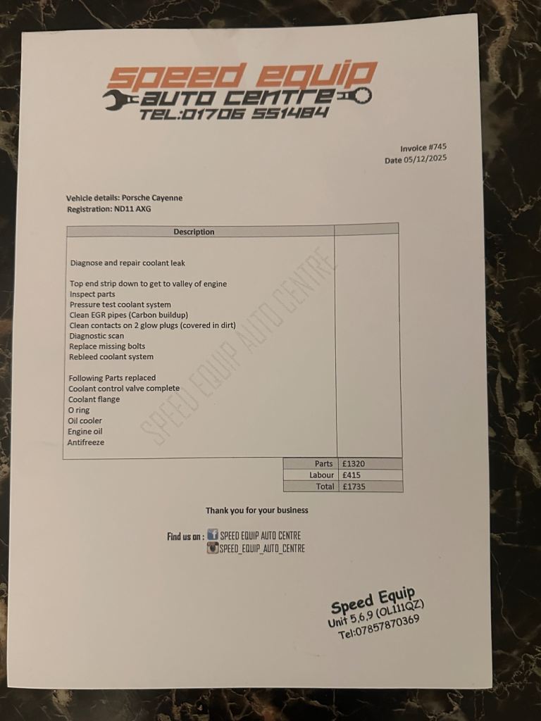 THOROUGHLY MAINTAINED + NO FAULTS + DRIVES PERFECTLY + ECONOMICAL CAR + HPI CLEAR + FULL SERVICE HISTORY + FULL V5 LOGBOOK + PORSCHE BOOK PACK + NEW WATER PUMP + NEW COOLANT REGULATOR VALVE OVER £1.5k WORK CARRIED OUT FOR NEW OWNER WITH RECEIPT + EGR CLEAN + NEW OIL COOLER BRAND NEW CAR NOW + VERY WELL LOOKED AFTER + HAS HAD FULL OIL SERVICE + NEW FRONT TYRE + 4 WHEEL ALIGNMENT TRACKING + CAMBER ALIGNMENT