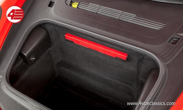 Finished in classic Porsche Guards Red this 981 Cayman looks fantastic against our studio backdrop. Even on very close inspection the paintwork is almost without fault aside from an expected dusting of very minor stone chips towards the front end. Both sides of the car are perfectly straight with no car park dings or scratches, and all the seals and trims around the body still look fresh. None of the wheels have any kerb marking, and with the slightly chunkier tyre wall the car rides extremely well. It was purchased from us by the current owners back in 2022 and of course we were only too pleased to have it back in the showroom.