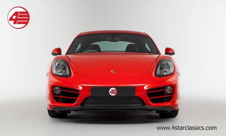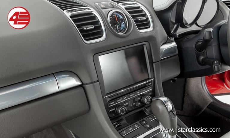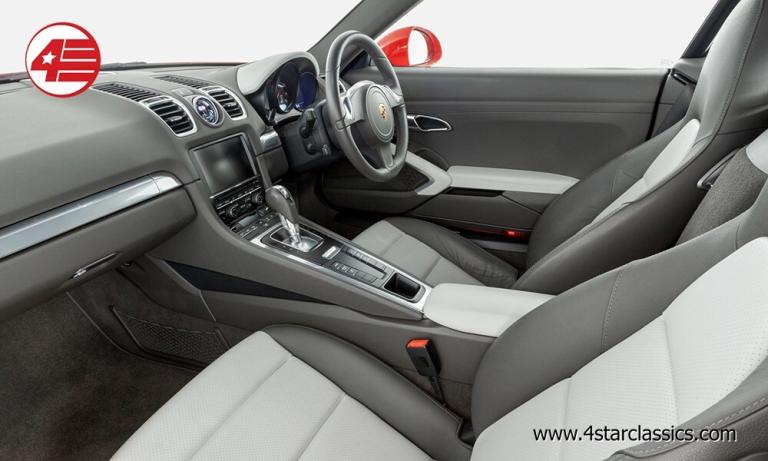 Guards Red paintwork, Two tone Agate Grey and Pebble Grey leather upholstery (Leather Package), 18-inch Cayman alloy wheels, Porsche Doppelkuplung (PDK) automatic transmission, Sports Exhaust System, Sound Package Plus, Sport Chrono Package, ParkAssist front and rear, Porsche Communication Management (PCM) including navigation module, Auxiliary and USB connectivity, Mobile phone preparation, Electric folding door mirrors, Automatic headlights, Rain-sensitive wipers, Cruise control, Digital climate control AC, Porsche floor mats, Spare key.