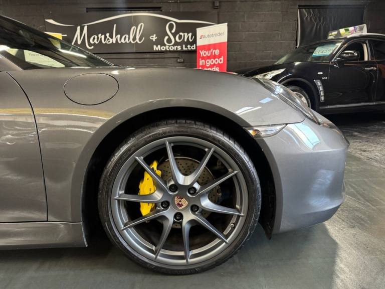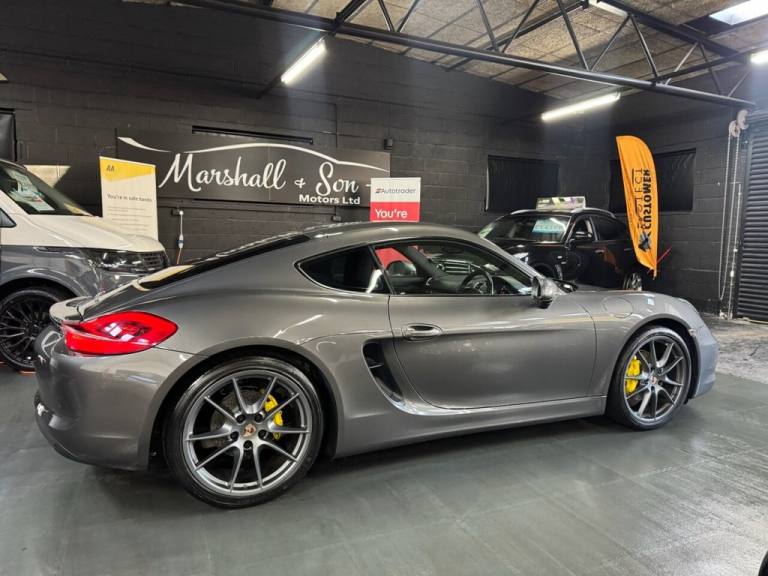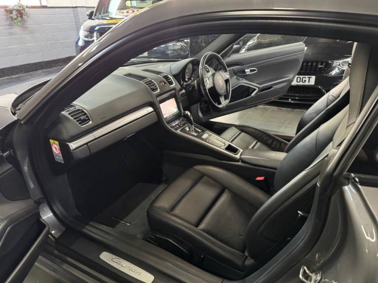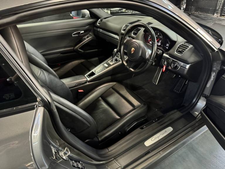 2014/64 Porsche Cayman 2.7 (981) PDK Agate Grey Metallic Full Black Leather Interior Presented in the ever-popular Agate Grey Metallic, this 2014/64 Porsche Cayman 2.7 (981) offers a superb balance of performance, comfort and everyday usability. Paired with Porsches highly regarded PDK automatic transmission, the Cayman delivers smooth, responsive gear changes and an engaging driving experience whether on a spirited weekend drive or daily use. The interior is finished in full black leather, providing a high-quality and timeless cabin environment that reflects Porsches renowned build standards. The car has been well maintained, benefitting from five recorded services and covered 55,000 miles, demonstrating careful ownership and consistent upkeep. Key Features & Specification: 2.7-litre flat-six petrol engine PDK automatic transmission Agate Grey Metallic exterior Full black leather interior Xenon headlights for improved visibility and a modern appearance 20-inch alloy wheels, enhancing both stance and road presence Pioneer touchscreen head unit Satellite navigation 5 services completed up to 54,000 miles This Cayman represents an excellent opportunity to own a modern Porsche sports car that remains practical, reliable and enjoyable to drive. Ideal for buyers seeking a prestigious yet sensible performance car, it offers strong residuals and an outstanding driving pedigree. A well-presented example that would make a superb addition to any driveway. OPEN 7 DAYS A WEEK. FULLY UNDERCOVER SHOWROOM AND CHOICE OF 70+ CARS.Agate Grey, 20in Alloy Wheels - Carrera S, Wheel Caps, Leather with Leather Interior - Black, Leather Package, 12-Volt Socket in Passenger Footwell, 12v Socket - Centre Console, 12v Socket Outlet in Glove Compartment, 18in Alloy Wheels - Cayman, 2 x 25 Watt Output, 7in Colour Display, ABD - Automatic Brake Differential, ABS - Anti-lock Brake System, Active Carbon Filter, Air Conditioning, Airbag - Driver, Airbag - Head, Airbag - Passenger, Airbag - Thorax in Seat Side Bolsters, Alarm System, Analogue Gauges for Engine Speed - Vehicle Speed - Fuel Level, Anti-Theft Wheel Protection, Armrests - Door Trim Panels and Centre Console Storage Compartment Lid Covered in Leather, ASR - Anti Slip Regulation, Automatic Hill-Hold, Automatically Extending Rear Spoiler, Auxiliary LED Light Modules in Front Apron Containing Daytime Running Lights and Position Lights, Bar in Front of Front End Air Intake in Black, Bi-Xenon Headlights with Integral Turn-Signal Indicators, Brake Assistant, Brake Calipers with Black Paint Finish, Cayman Logotype in Front of Gear-Shift or PDK-Selector, CDR Audio System, Clear Glass H7 Halogen Projection Headlights with Integral Turn Signal Indicators, Clothes Hooks on Seat Backrests, Cupholders, Daytime Running Lights - LED, Door Brakes with Three Rest Positions, Door Entry Guards with Model Designation, Door Mirrors - Electrically Adjustable and Heated, Doors and Hood Front and Rear Made of Aluminium, EDTC - Engine Drag Torque Control, Electric Parking Brake, Electric Windows - Lifts with One Touch Operation, Electronic Immobiliser - Transponder System, Enhanced Porsche Stability Management - PSM, Floor Mats, Front Lip Spoiler in Black-Unpainted, Gear Indicator in Rev Counter, Glove Compartment - Lockable, Glove Compartment Illumination, Green Tinted Heat-Insulating Glass, Headlight Assistance, Headlight Cleaning System, Heated Glass Rear Screen, Instrument Cluster with Central Rev Counter and 4.6in TFT VGA Display, Instruments Cluster with Black Dials and Central Rev Counter with Aluminium-Coloured Dials, Integral Head Restraints on Seats, Integrated Cluster of Three Round Instruments, LED Reading Lights Orientation Ignition Lock and Vanity Mirror Lighting, LED Rear Lights and Third Brake Light, Lightweight Bodyshell in Steel-Aluminium Design, Lightweight Spring-Strut Suspension, Manual Seat Height Adjustment, On-Board Computer, On-Board Diagnostics for Monitoring of the Emission Control System, Operated Hood with Heated Glass Rear Screen,