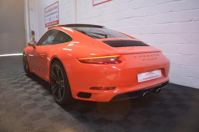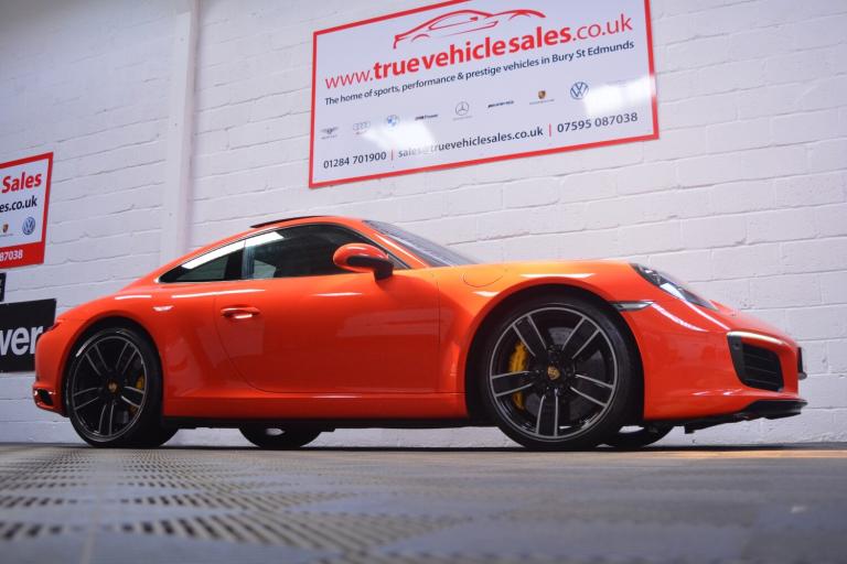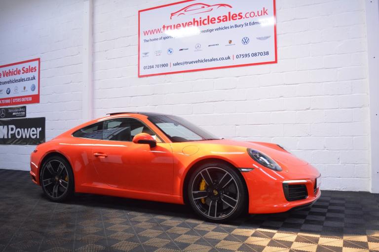 ***** OVER 50 VEHICLES IN STOCK FREE UK DELIVERY TO YOUR HOME OR WORK ALL SALES BY APPOINTMENT ONLY PLEASE CALL WHATSAPP OR EMAIL FOR IMMEDIATE RESPONSE ***** Another absolutely stunning 1 previous owner Lava Orange 991 Coupe. Previously supplied by us this rare and unique high specification example is equipped with some fantastic features including : Electric tilt/sliding panoramic glass sunroof, Porsche ceramic composite brakes, sports exhaust system, PDK gearbox, heated and cooling ventilated seats, adaptive cruise control, front axle lift system, light design package, park assist front and rear, power steering plus, electric folding door mirrors, GT sport leather steering wheel, BOSE surround sound system, 18 way adaptive sports seats, PDLS LED headlights, sun visors in leather, privacy glass, totally unmarked 20 inch Carrera sport ally wheels wrapped in a matching set of premium quality Porsche rated Pirelli P Zero performance tyres, illuminated door sill guards finished in stainless steel, tinted tail lights, aluminium PDK gear selector, TPMS, Apple Carplay, PCM navigation, voice control, plus standard features. This vehicle has never been smoked in, has both sets of remote keys and also benefits from £3,400 of professionally fitted PPF covering the front end of the car. This stunning low mileage example was 1st serviced at Porsche Exeter on 24/07/19 at 14,434 miles and the 2nd (Major) service was completed at Porsche Colchester on 21/12/23 at 22,138 miles. Next service showing due in 16,800 miles or December 2025. Clearly this vehicle has spent much of its life sitting inside under cover. 6 months road tax is 104.50 and 12 months is 190.00 (Plus additional government surcharges )PCP example 10,000 customer deposit 48 x 799.98 with a final payment of 38619.00 at the end of the term. APR 8.9 percent. Finance subject to status. Please ask for a full written quotation. Finance packages available for personal and business users. Excess mileage 5-8 pence per mile, flat rate 4.61 percent talk to us about tailor made finance packages to suit your needs.ORFinance Quotation 1232.50 per month - Finance is based on 10,000 customer deposit followed by 59 monthly payments of 1232.50. Flat Rate 4.65 percent. Typical APR 8.9 percent. Finance subject to status. Please ask for a full written quotation. Finance packages available for personal and business users.True Vehicle Sales is THE Sports, Performance & Prestige used vehicle specialist in Bury St Edmunds. We are a totally independent family run business that takes great pride in our work, choosing to concentrate on low owner, high specification, interesting German manufactured vehicles from leading manufacturers including Audi, Bentley, BMW, Mercedes-Benz, Porsche & Volkswagen. We operate from a large indoor fully alarmed & CCTV protected premises with all of our vehicles being kept inside and undercover from the weather and usually have around fifty vehicles in stock. We work on an appointment only basis so please call to discuss and arrange a viewing. We have many years of motor trade experience and are a well established business offering high quality, no hassle, honest customer service and the best vehicles we can find. All our vehicles are prepared to the highest standards by local independent or main dealer garages and every vehicle comes with warranty, MOT and service history. We specialise in distance sales, offer walk around videos and free delivery to your home or work across the UK. Please call to discuss any of your vehicle requirements, we can find your next car and offer you the best possible no hassle buying experience available. Check out our 5 star Google reviews and feel free to get in touch.