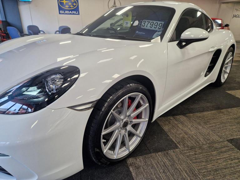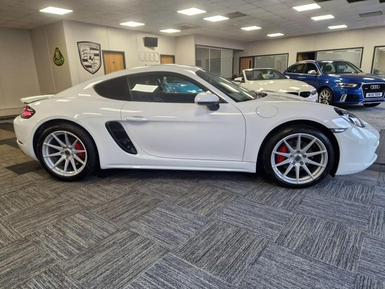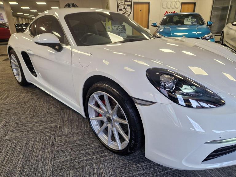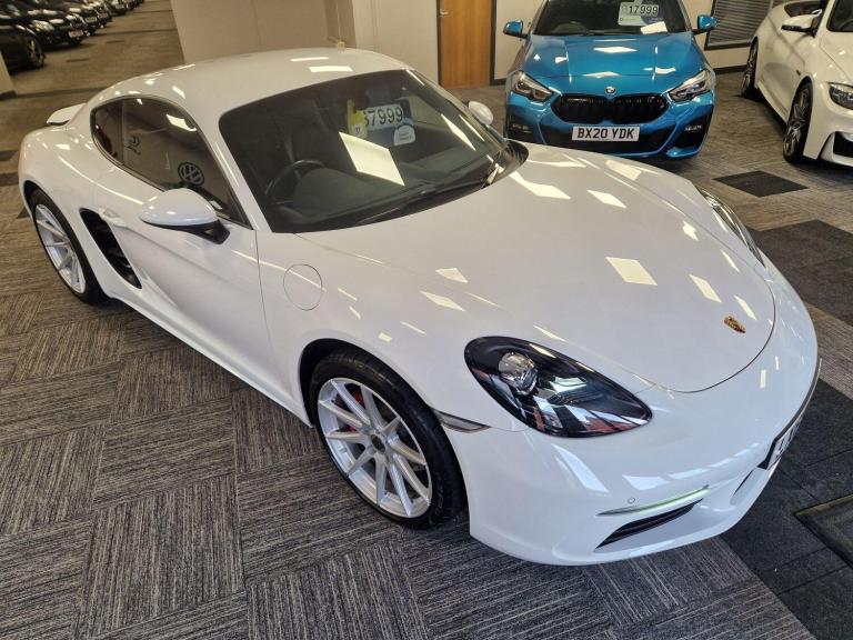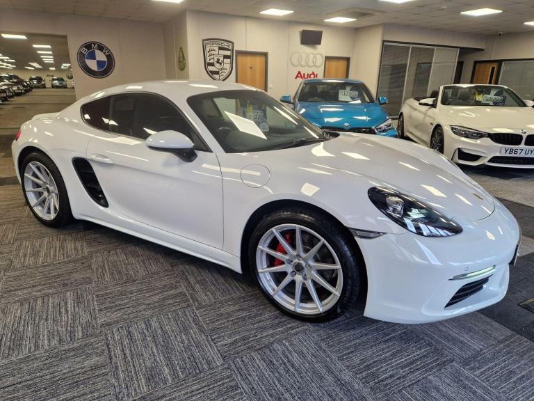 The 4th generation Cayman now becomes the 718, a nod to Porsche's racing heritage that won the Targa Florio race in 1959 and 1960. Because the 718 has lost two cylinders making the engine block lighter, going from a naturally aspirated flat-6 engine to a turbocharged flat-4 engine, the aim is meant to evoke a racing series that was won by a light car which outmaneuvered the cars with more powerful heavier engines, and with 295 BHP this tarmac negotiator delivers a very impressive 0-60 in just 5.3 seconds, with pretty good fuel economy and only 190 a year to tax. Obviously Porshe's have a reputation for power but moreover they're just as desired for their looks, and with the curvaceous lines and styling the Cayman is one sexy looking sports car. A sharp looking example in glacier white gloss sat on upgrade 19 inch 10 spoke alloys over red calipers. An exceptionally low mileage find that has only averaged 1k miles per year and it shows in the condition and drive. The Porsche has been serviced at 2k and 4k, and we will service it now at 7k miles along with a fresh 12 months m.o.t, multi point pre-delivery inspection, and be supplied with 2 keys and warranty. Looks the part and so should the price! 37,999!!
