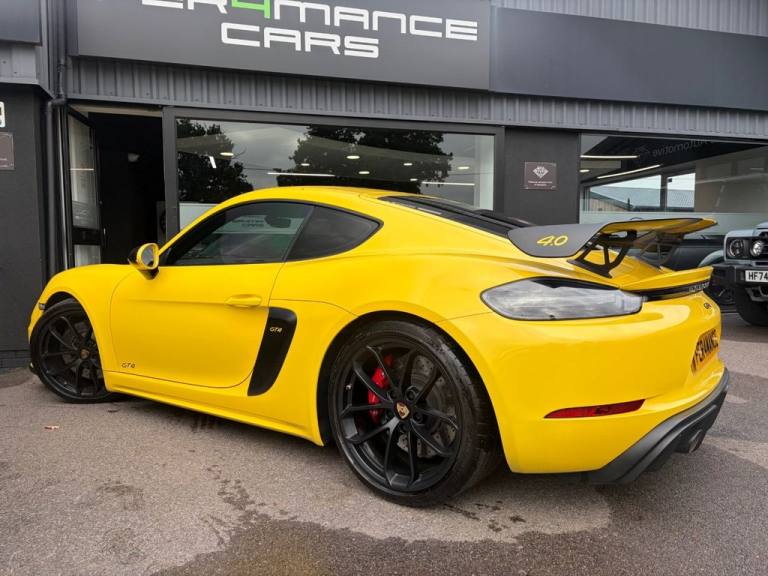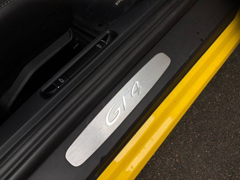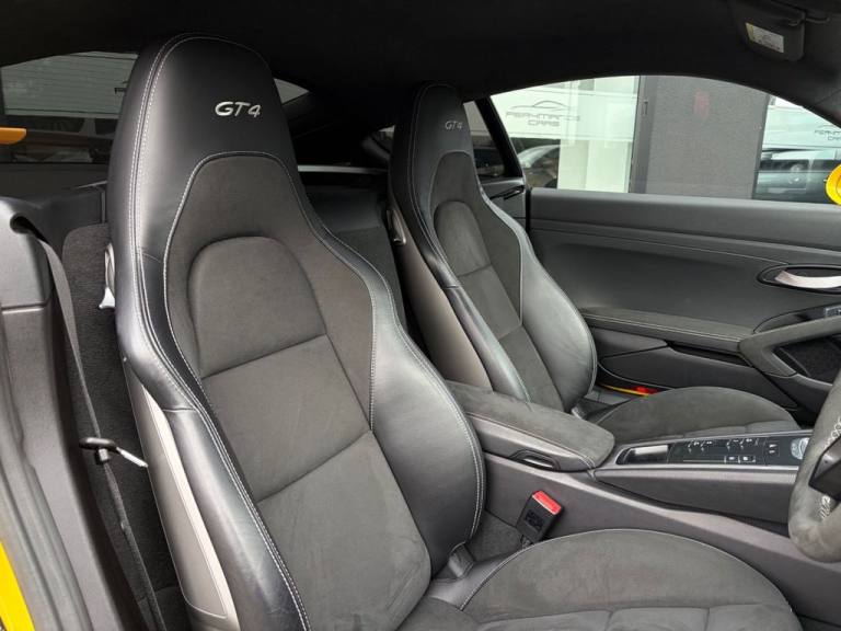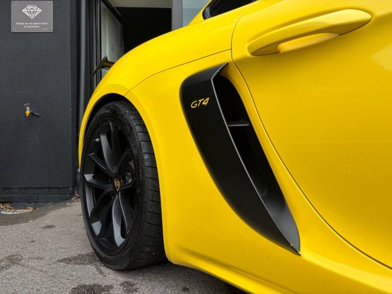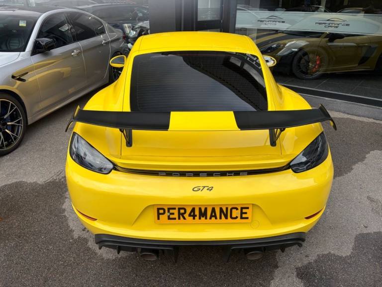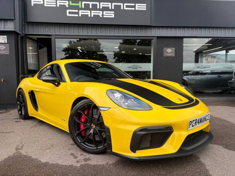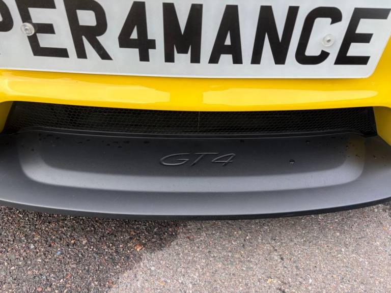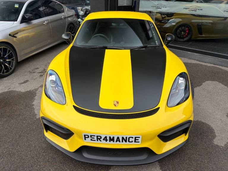 PER4MANCE CARS ARE PROUD TO OFFER THIS STUNNING PORSCHE 718 CAYMAN GTC COUPE (420PS) FINISHED IN RACING YELLOW WITH PART BLACK LEATHER AND PART ALCANTARA SEATS WITH CONTRAST STITCHING, PORSCHE COMMUNICATION MANAGEMENT INCLUDING SATELLITE NAVIGATION, BLUETOOTH AND DAB, SOUND PACKAGE PLUS, HEATED FRONT SEATS, DUAL ZONE CLIMATE CONTROL, 20" GLOSS BLACK ALLOY WHEELS, TYRE PRESSURE MONITOR, RED BRAKE CALIPERS, BONNET DECALS, GT4 REAR WING IN GLOSS BLACK, FRONT APRON WITH LARGE COOLING INTAKES, TWIN TRACT SPORTS EXHAUST SYSTEM, BI XENON HEADLIGHTS, AUTO LIGHTS, GT4 DOOR SILL GUARDS, SPORTS SEATS PLUS, PORSCHE ACTIVE SUSPENSION MANAGEMENT AND. UCH MUCH MORE... CAR MAY NOT BE ON SITE PLEASE CALL TO MAKE AN APPOINTMENT! Full dealer facilities available, Finance available, please apply via our website or call for a quote. We have a team of experienced buyers who hand pick our cars from all parts of the UK so you can buy with confidence all vehicles are HPI Clear and prepared to the highest standard. We believe in providing our customers with a personal and first class level of service, Full dealer facilities available, Part exchanges welcomed. CONTACT OUR EXPERIENCED SALES TEAM ON [Phone number removed] OR EMAIL [Email address removed. Click Email button to contact us.]. .12-Volt Sockets in Passenger Footwell and Centre Console Storage Compartment, 20in Alloy Wheels - 718 Cayman GT4 in Satin Platinum Finish with Sports Tyres, AUTO BLIP Button to Activate Automatic Rev-Matching for Downshifts, Adjustable Chassis For Track Use, Adjustable Fan with Air Recirculation and Defroster Functions, Air Conditioning with Integrated Active Carbon Filter, Alarm System, Anti-Theft Wheel Bolts, Ascending Centre Console with an Uncovered Storage Compartment and a Closed Storage Compartment, Automatic Headlight Activation including Welcome Home Lighting, Bi-Xenon Headlights with Integrated LED Daytime Running Lights, Brake Calipers - Red, Clothes Hooks on Seat Backrests, Digital Displays for Vehicle Speed - Chosen Gear - Odometer -Trip Meter and Time, Digital Radio, Door Opening Loops in Silver, Door Panel Armrest and Centre Console Main Storage Compartment Lid in Smooth Finish Leather, Door Sill Guards - Model Designation Logo, Dynamic Gearbox Mount System, Electric Windows with One-Touch Operation and Door Seal Protection Function, Electrically Adjustable Heated Exterior Mirrors on Door Waist Rails - Aspherical on Drivers Side, Electrically Controlled Parking Brake, Electromechanical Direct Steering with Variable Steering Ratio and Steering Pulse Generator, Engine Water Cooled with Thermal Management, Fixed GT4 Rear Wing in Exterior Colour with Integrated Sideplates - Wing Uprights in Black Aluminium, Floor Mats, Front Apron with Large Cooling Intakes, Full Size Airbags for Driver and Front Passenger, GT4 Logo on Gear Lever, GT4 Sports Steering Wheel - Rim in Race-Tex with Black Finish, Green Tinted Heat-Insulating Glass, Instrument Cluster with Central Rev Counter and High Resolution 4.6inch Colour Display, Instrument Dials in Black with Yellow Indices and Scales - Rev Counter in Titanium Colour - GT4 Logo, Intelligent Lightweight in Aluminium-Steel-Composite Construction, Interior Package - Brushed Aluminium, LED Reading Lights - Orientation Lighting and Ignition Lock - Additionally Luggage Compartment and Glove Box Lighting, LED Taillights and Integral 4-Point Brake Lights and Reversing Lights, Lightweight Spring Strut Front Axle - Anti-Roll Bar - Suspension Mountings Partly Ball-Jointed, Lightweight Spring Strut Rear Axle - Helper Springs - Anti-Roll Bar - Suspension Mountings Partly Ball-Jointed, Luggage Compartments at Front and Rear, PASM - Porsche Active Suspension Management - Variable Damper System with Sports Setup and Ride Heig