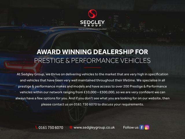 At Sedgley Group, we thrive on delivering vehicles to the market that are very high in specification and vehicles that have been very well maintained throughout their lifetime. We specialise in all prestige & performance makes and models and have access to over 200 Prestige & Performance vehicles within our network ranging from £10,000 – £500,000, so we are very confident we can always have a few options for you. And if you don’t see what you are looking for on our website, then please contact us on 0161 750 6070 to discuss your requirements