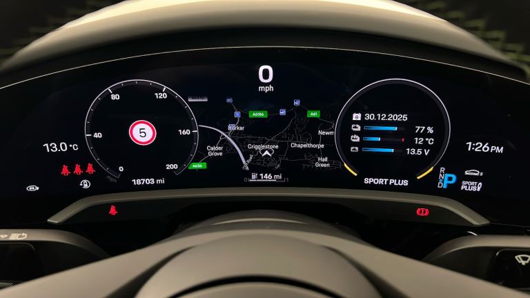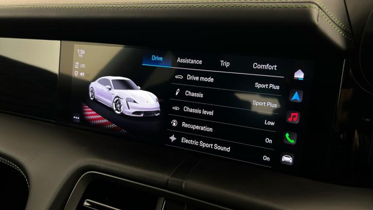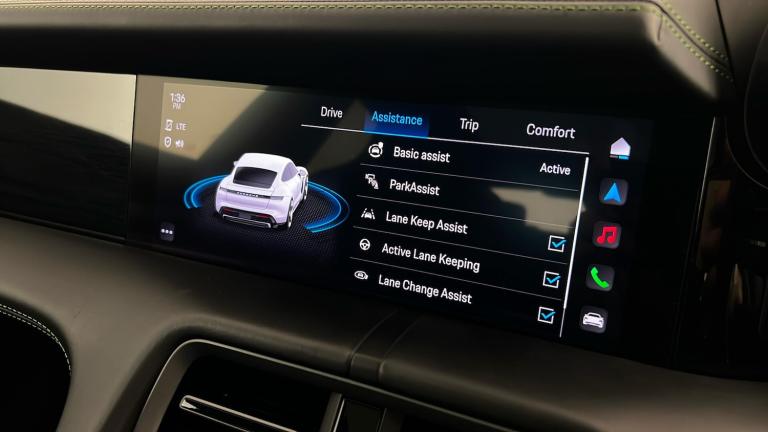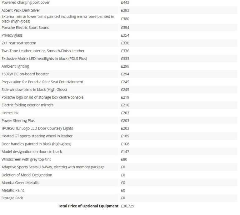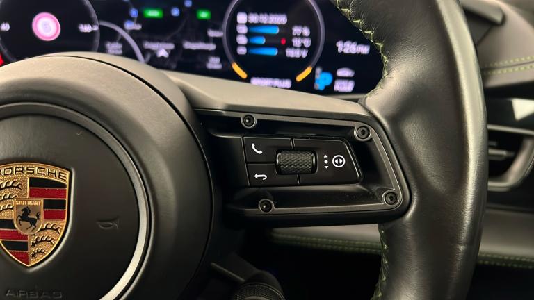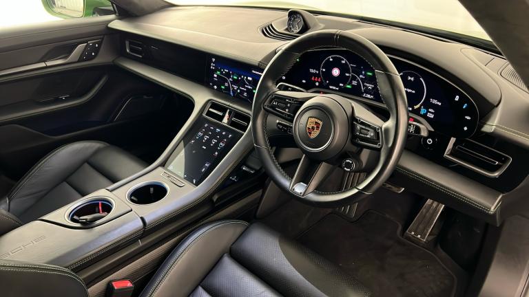 ..21in Alloy Wheels - Mission E Design, Burmester High-End 3D Surround Sound System, Exclusive Matrix LED Headlights in Black with Porsche Dynamic Light System Plus, PSCB - Porsche Surface Coated Brake - Calipers Painted in Black - High-Gloss, Interior Trim Package with Decorative Stitching and Leather Seat Centres in Contrasting Colour, Interior Package - Carbon, Porsche Dynamic Chassis Control Sport - PDCC Sport, Fixed Glass Panoramic Roof, Head Up Display, Lane Change Assist, Preparation for Porsche Rear Seat Entertainment, Porsche InnoDrive including Adaptive Cruise Assist, ParkAssist Including Surround View, Sport Chrono Package with Porsche Design Subsecond Clock, SportDesign Side Skirts, Rear Light Strip with PORSCHE logo in Black, 18-Way Adaptive Sports Seats - Front with Memory Package, 150kW DC On-Board Booster, GT Sport Steering Wheel in Leather - Heated, Power Steering Plus, Door Handles Painted in Black - High-Gloss, Privacy Glass, Electrically Folding Exterior Mirrors, Bespoke Door Sill Guards in Matt Carbon Illuminated, Advanced 4-Zone Climate Control, Model Designation Painted - Black High-Gloss, 4+1 Seats System, Model Logo on Centre Console Storage Compartment Lid, Comfort Access, Porsche Logo LED Door Courtesy Lights, Wheels Painted in High Gloss Black, Powered Charging Port Cover, Side Window Trims - Black High Gloss, Windscreen with Grey Top-Tint, Exterior Mirror Lower Trims Painted and Mirror Base Painted in Black High-Gloss, Accent Package in Dark Silver, Ambient Lighting, HomeLink - Garage Door Opener, Smooth Finish Leather - Black, Storage Package, Porsche Electric Sport Sound, 22kW On-Board AC Charger, 11kW AC On-Board Charger, 12v Electrical Socket in Rear Luggage Compartment, 12v Electrical Socket in the Centre Console Storage Compartment, 16.8in Curved Display, 2 USB-C Charge Ports in the Rear, 2 USB-C Connectivity and Charge Ports in the Centre Console Storage Compartment, 20in Alloy Wheels - Taycan Turbo Aero, 3-Point Automatic Seat Belts with Pre-Tensioners - Front and Outer Rear Seats and Front Force Limiter, 4-Point LED Daytime Running Lights, 50kW DC On-Board Charger for use of Public Charging Stations with a voltage of 400V, ABS - Anti-lock Brake System, Accent Package in Black, Active Bonnet System, Active Carbon Fine Dust Filter, Adaptive Air Suspension including Porsche Active Suspension Management - PASM, Advanced 2-Zone Climate Control, Aluminium Double-Wishbone Front Axle, Aluminium Multi-Link Rear Axle,