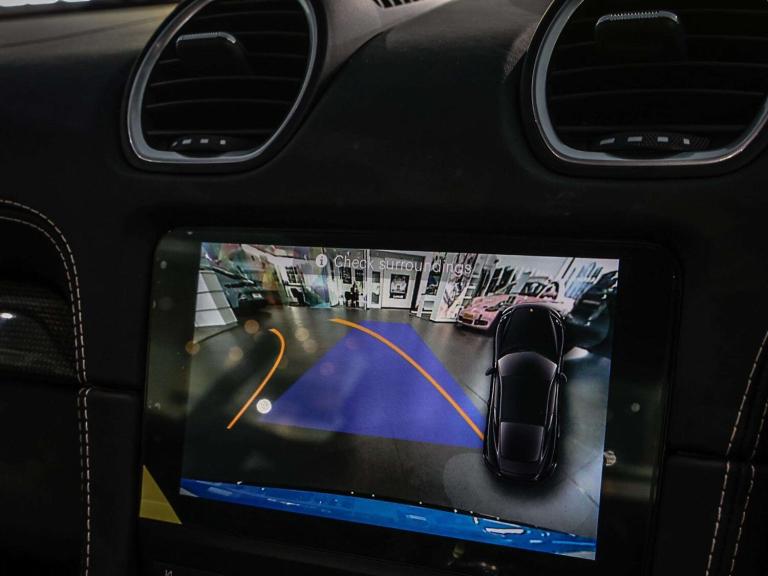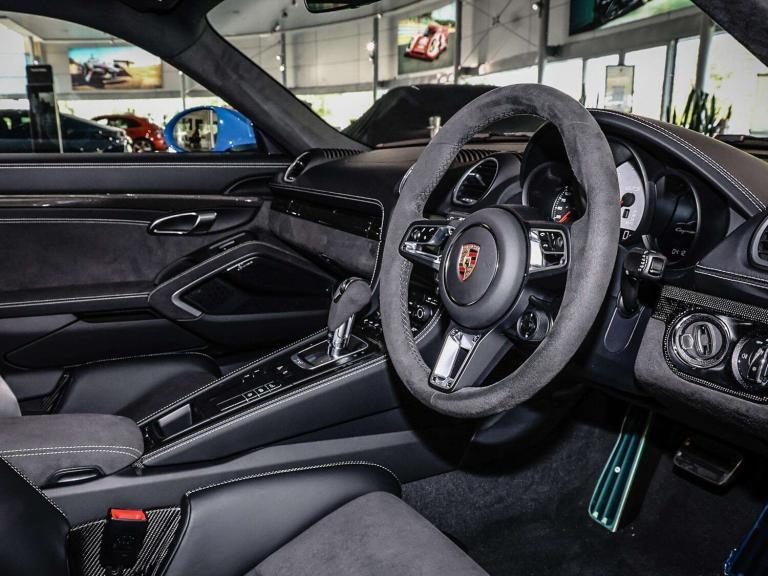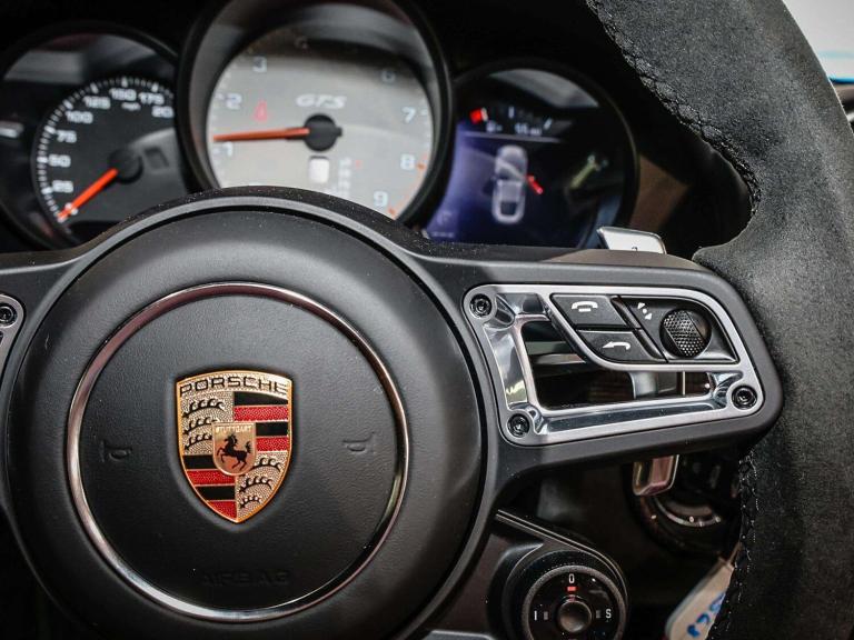 Brake calipers painted in black (high-gloss) (XBS), Burmester® High-End Surround Sound System (9VJ), Door sill guards carbon, illuminated (XXD), Door release levers painted in Black (high-gloss) (XJA), Exclusive Design fuel filler cap (XYB), Fire extinguisher (509), Full bucket seats (P11), GTS interior package (088), LED main headlights including Porsche Dynamic Light System (PDLS) (634), Light design package (630), Instrument dials in crayon (026), ParkAssist (front and rear) including reversing camera (638), Porsche Crest on storage compartment lid Race-Tex (XLJ), Power steering Plus (658), Rear wing painted in black (high-gloss) (XAY), Side window trims and window triangle trims painted in black (high-gloss) (XJH), SportDesign package painted in black (high-gloss) (XAN), Sun visors Race-Tex (XLU), Two-zone automatic climate control (573)