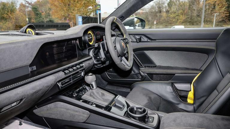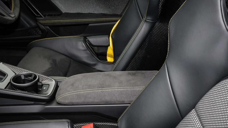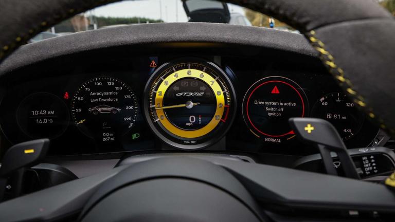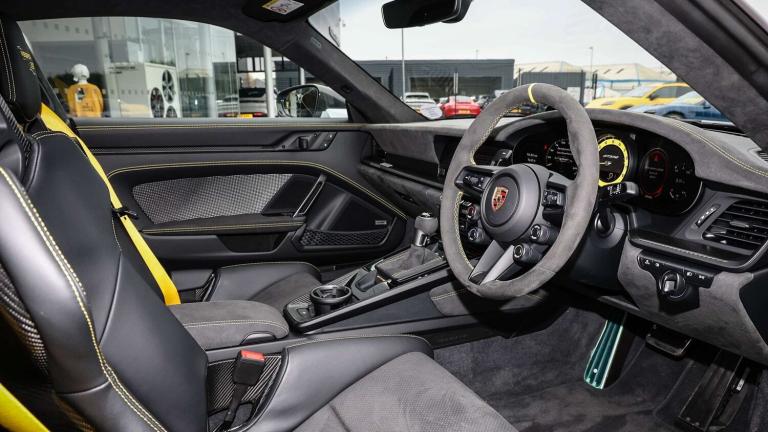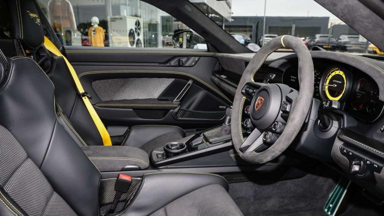 Weissach package without roll cage (04I), Club Sport Package (6A9), Lifting system front axle (2UH), Porsche Ceramic Composite Brake (PCCB) (1LQ), Wheels painted in Pyro Red (1NC), 20-/21-Inch GT3 RS forged Magnesium lightweight wheels (56R), Interior Trim Package with decorative stitching and embroidery in contrasting colour (6RD), Tachometer Dial racing yellow (8PC), Chrono Stopwatch Instrument Dial racing yellow (VN1), Seat Belts racing yellow (FZ4), Door opening loops black (5DC), Storage Compartment Lid Race-Tex with Porsche Crest (6E5), BOSE® Surround Sound System (9VL), LED main headlights in black incl. Porsche Dynamic Light System (PDLS) (8JT), Exclusive design taillights (8VH), BORN IN FLACHT’ Logo LED Door Courtesy Lights (UD1), Privacy glass (VW7), Reversing camera (KA2), Light-Design Package (QQ2)