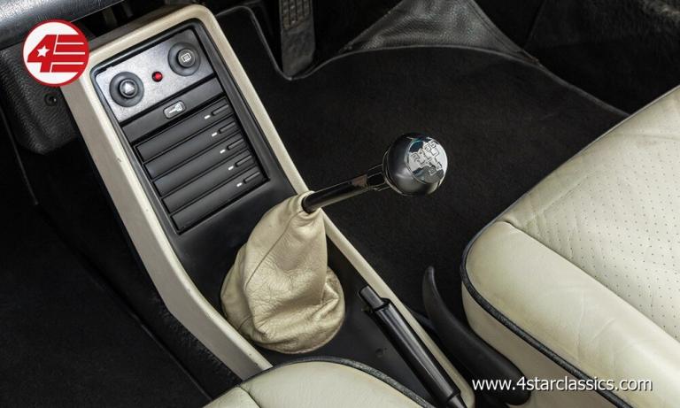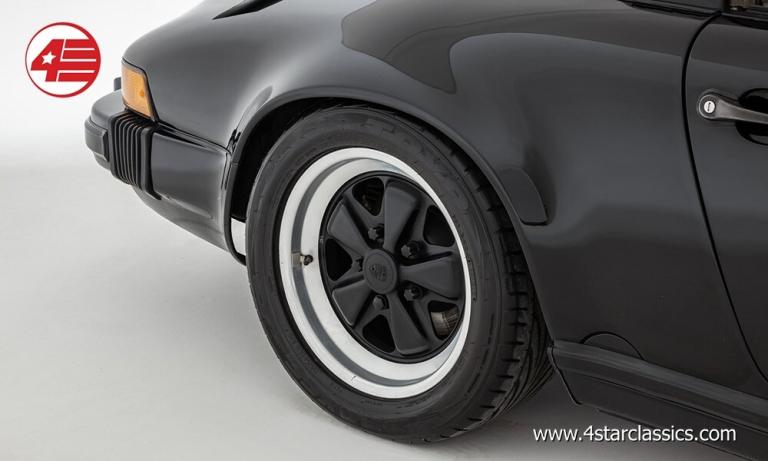 Looking every bit the 80s poster car, this G50 Targa with the optional Sport Equipment strikes a stunning pose against our studio backdrop. The entire body has just been treated to a full detail and machine polish resulting in a deep black shine that's free from any swirl marks. All the badges and rubbers are also in excellent shape, as are the rear spoiler and rollover bar. Aside from one or two small blemishes the car looks fantastic and seemingly defies both its years and miles. The vinyl Targa roof fits well and none of the lights show any signs of moisture ingress. With its slightly lower ride height and correct Fuchs wheels, it's a particularly striking example in black.