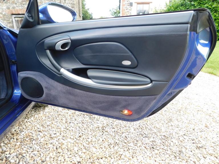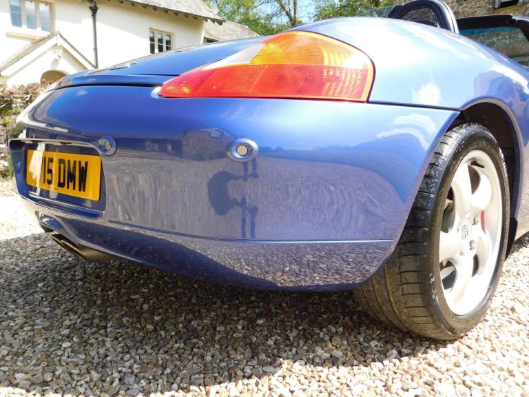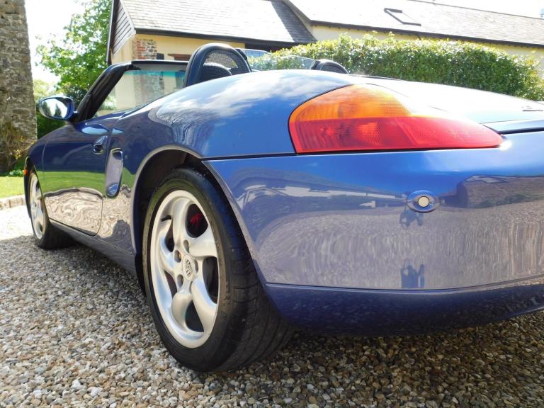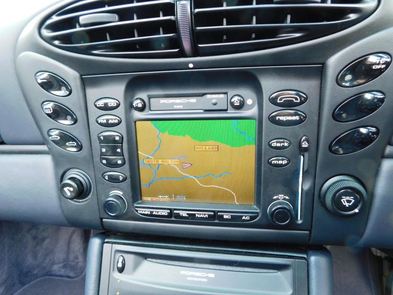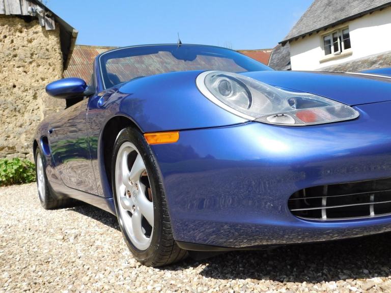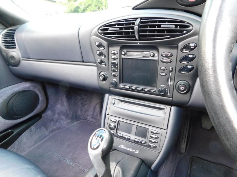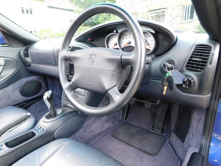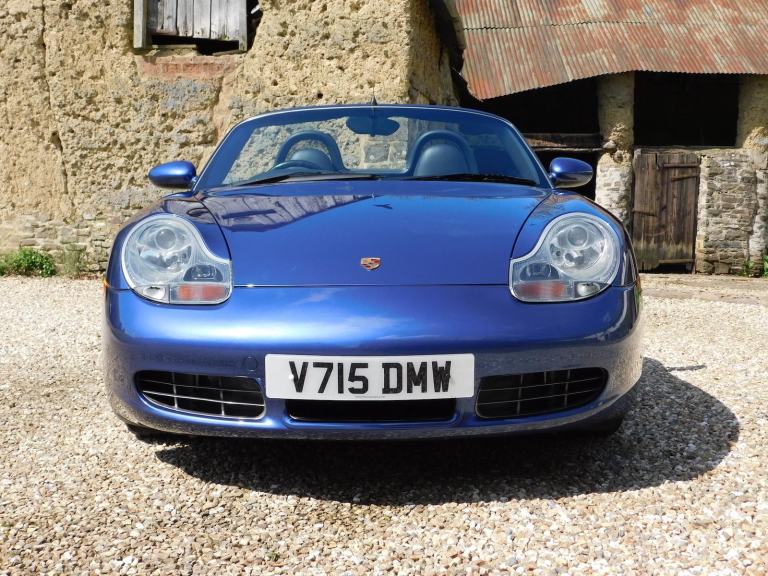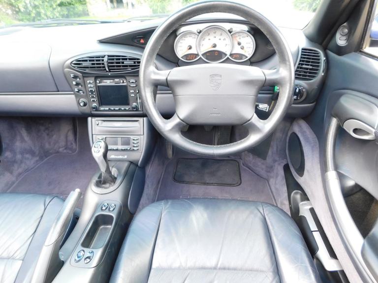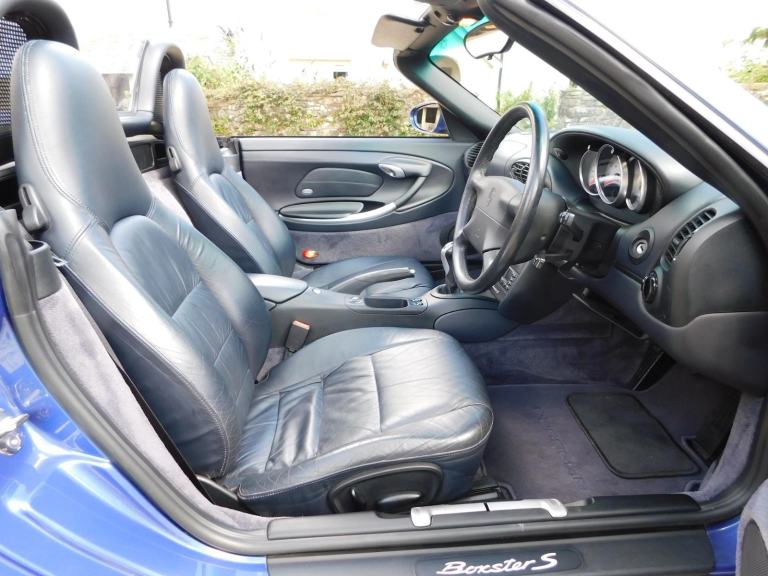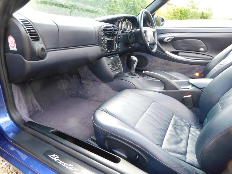 V715DMW. 2000 986 Boxster 3.2 S 6-speed manual. Zenith Blue, Metropole blue leather. 39,977 miles. This is a spectacular 986 Boxster 3.2 S that we are pleased to welcome back, having first acquired it in 2020 and subsequently sold it to it's last two owners (who have both sold it back to us when they have bought another Porsche from us). V715DMW is one of the earliest 3.2 S models, having been built in late 1999 and first registered on 6th January 2000 by Dick Lovett in Swindon. The car was specified with a number of high value options, including extended leather to the dash and door panels, the original Porsche PCM system with satellite navigation, pleated leather seats, cruise control, Litronic xenon headlights with headlamp washers, ParkAssistant, ASR and ABD traction control (the forerunner to PSM), and automatic air conditioning.