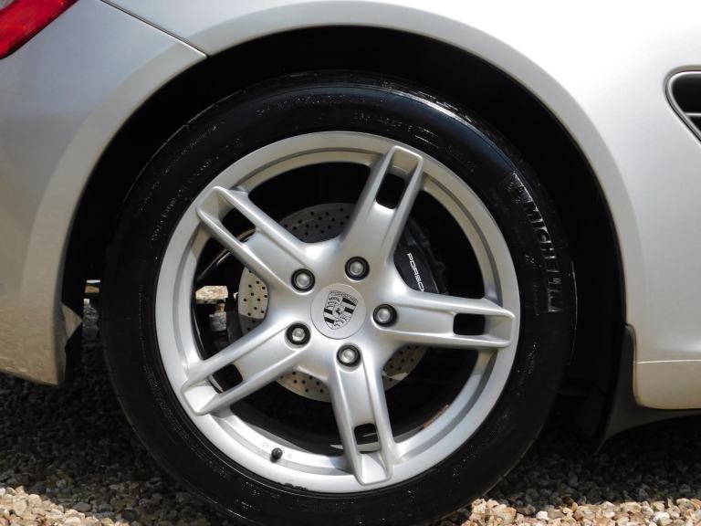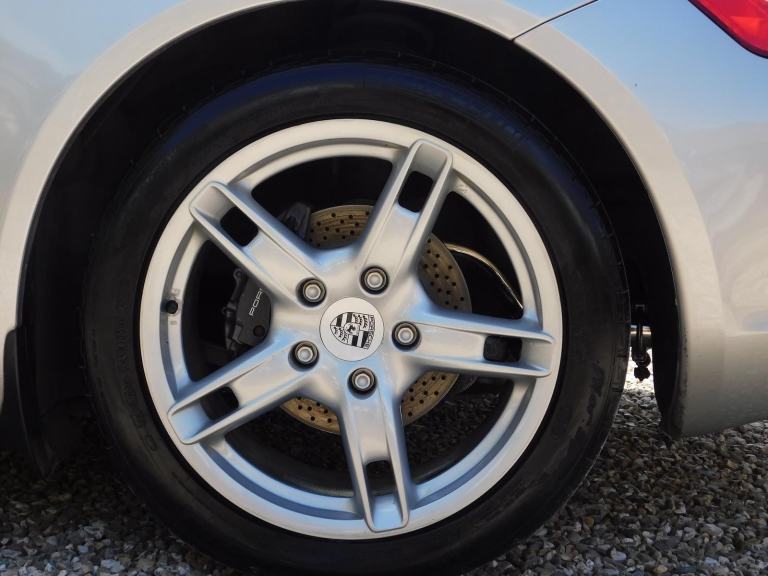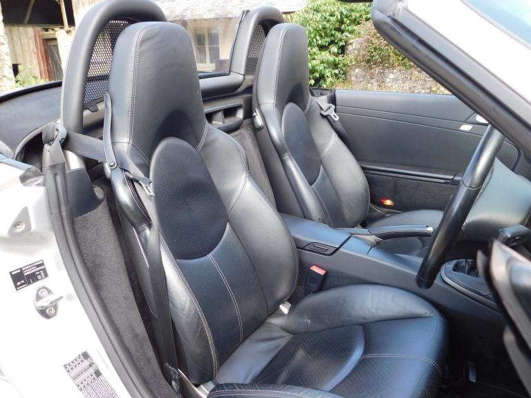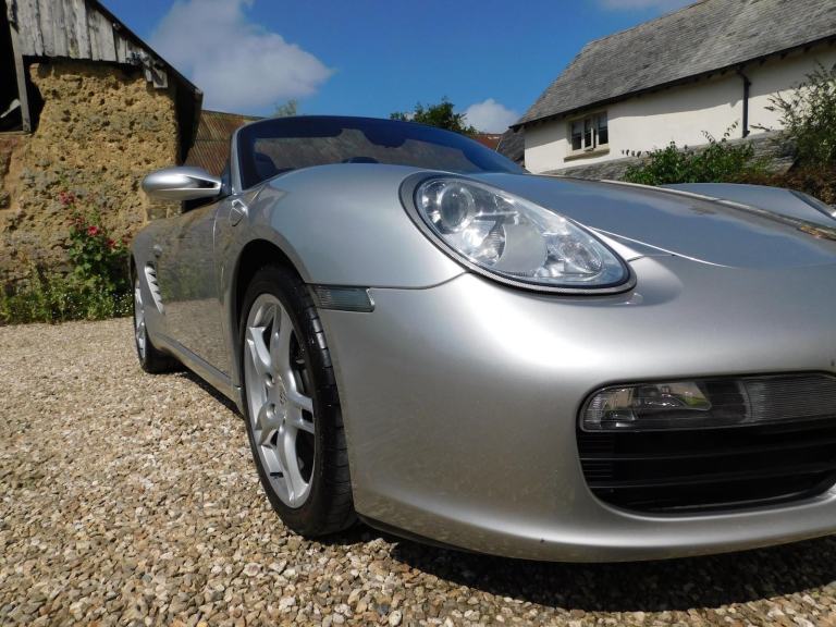 2006 987.1 Boxster 2.7, 5-speed manual. Classic colour combination of Arctic Silver with black leather interior. 88,422 miles. 5 owners, 12 service stamps, 5 from Porsche. Heated sports seats, BOSE, 18″ Boxster S ‘crab claw’ wheels, ParkAssistant, DesignTek stainless steel exhaust. Lovely car with good history, drives beautifully.