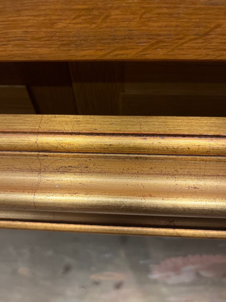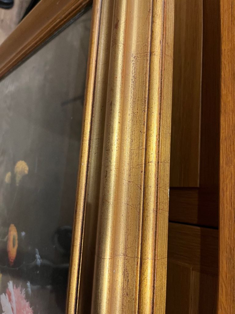 This lovely picture is in a heavy wooden antique style gilt frame. The picture is a print of Still Life: Flowers and Fruit by 19th century German American artist Severin Roesen. The frame could also be used for a mirror. Original cost £250