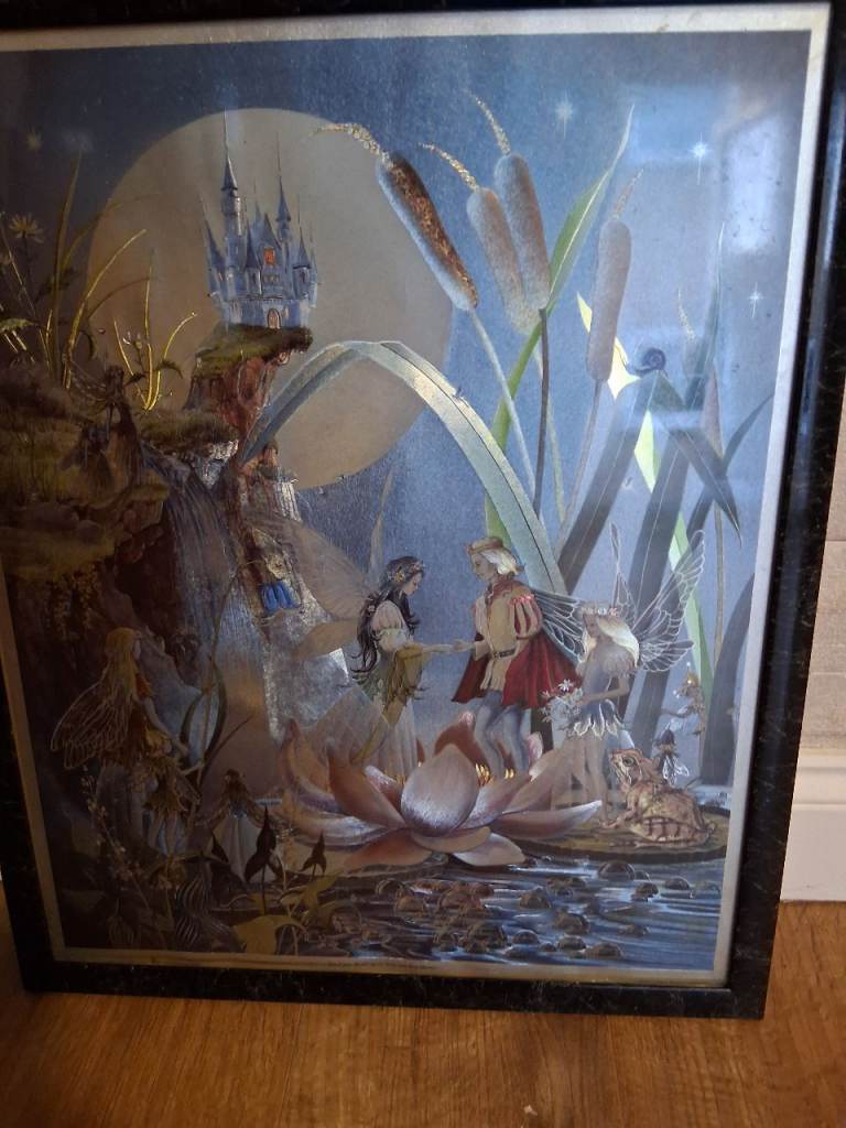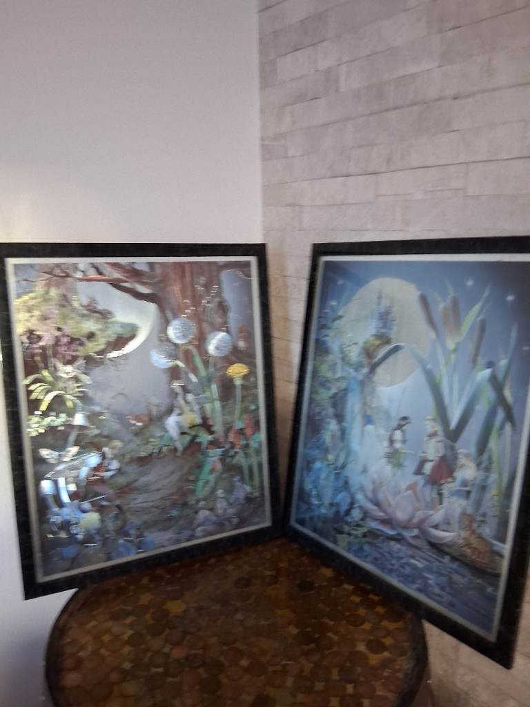 Two vintage art works of jean and ron hendry one is the first meeting the other is the wedding they are in amazing black frames and are in great condition .look fantastic on wall.