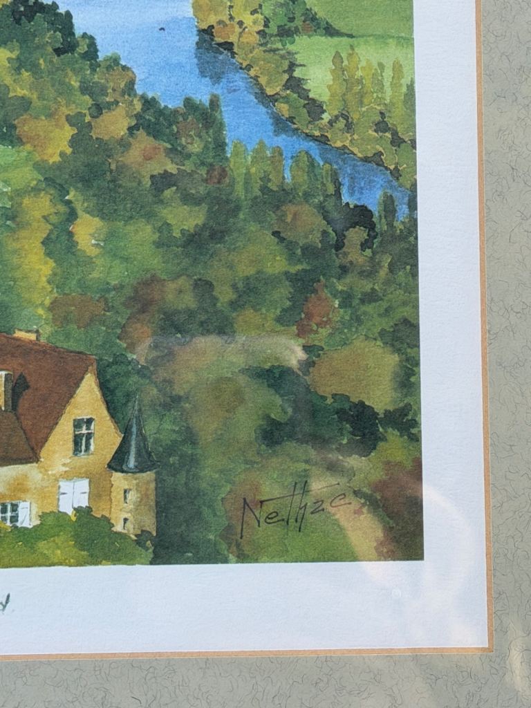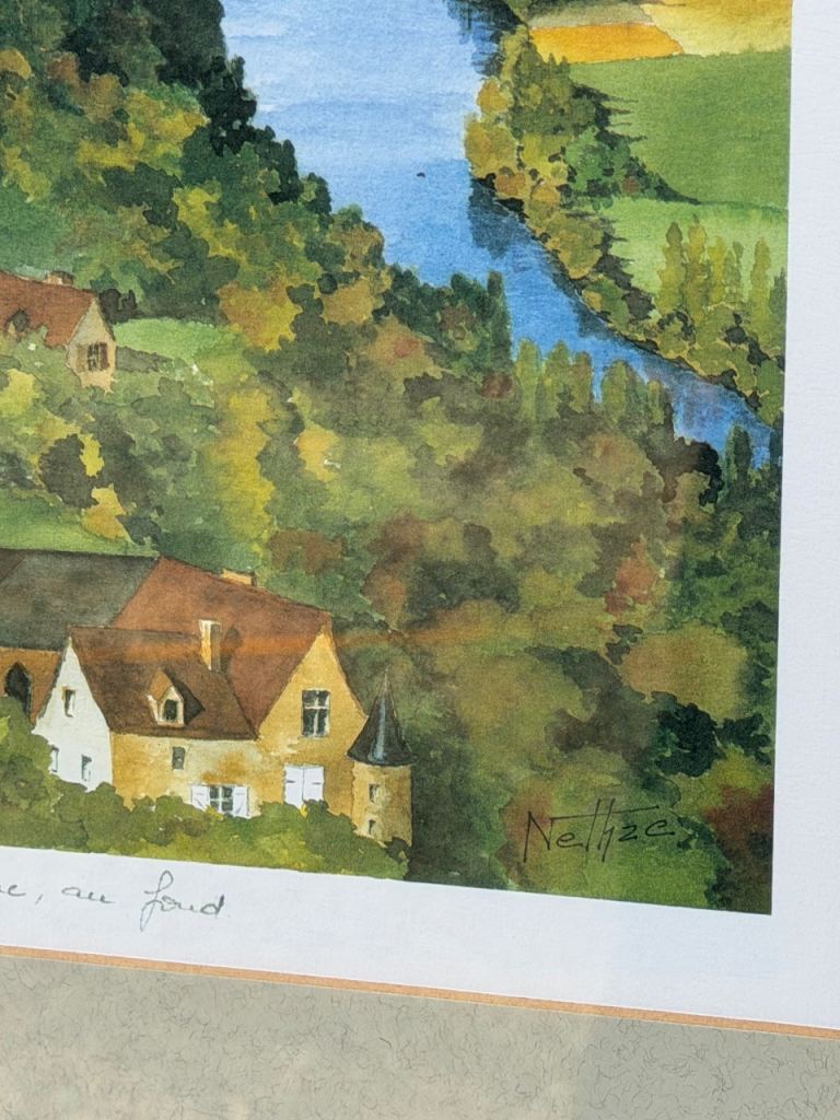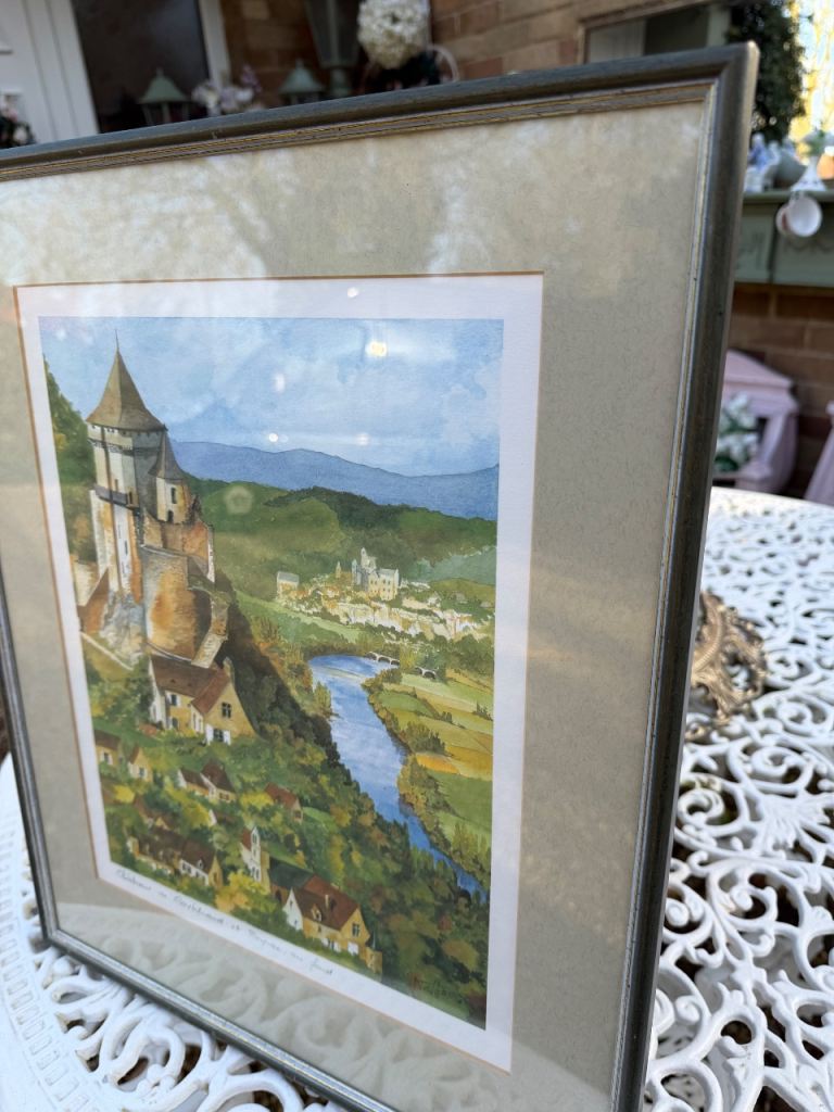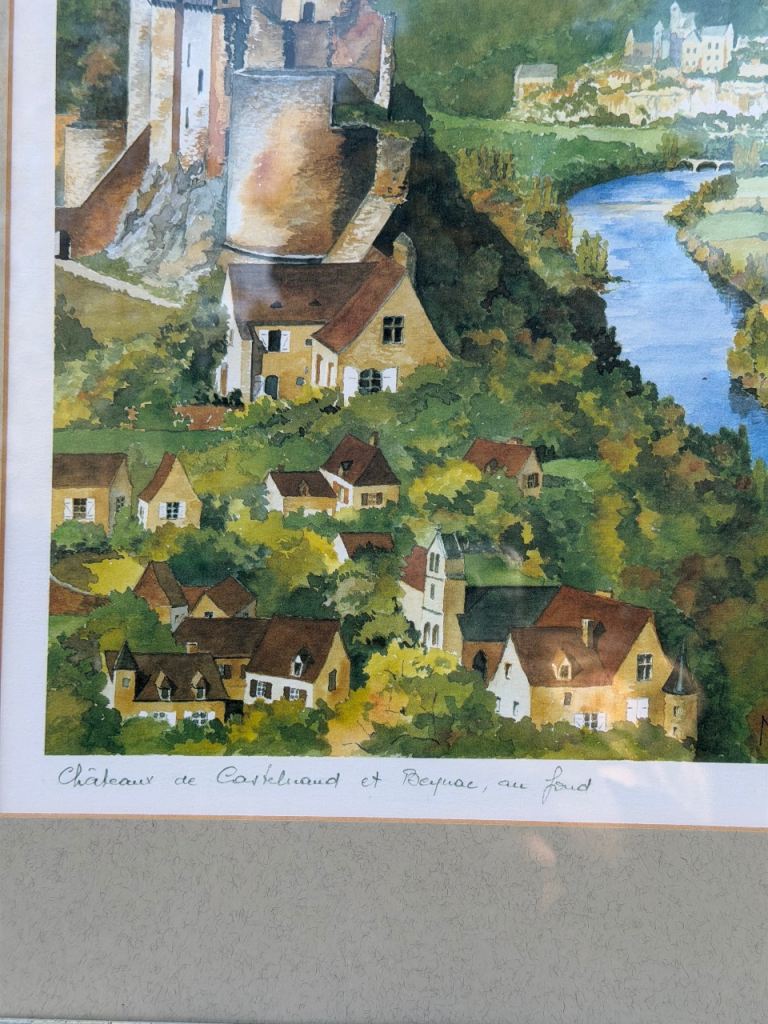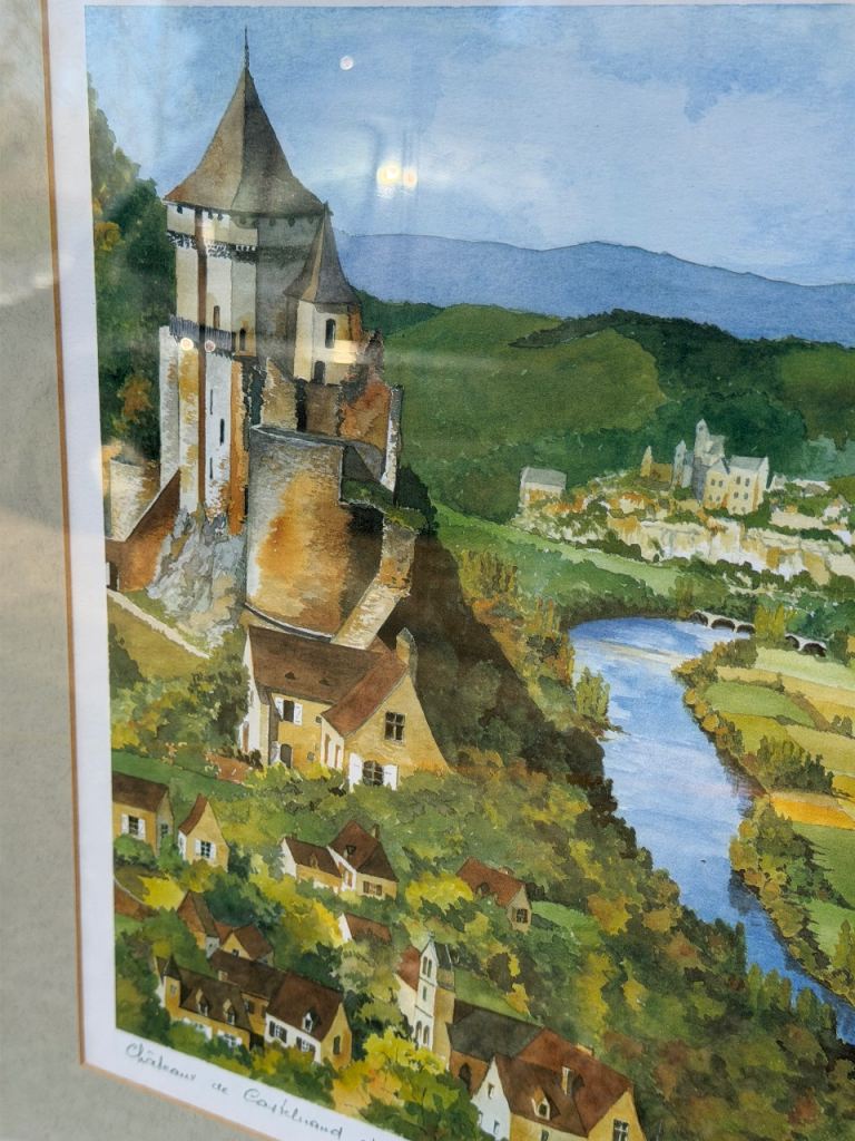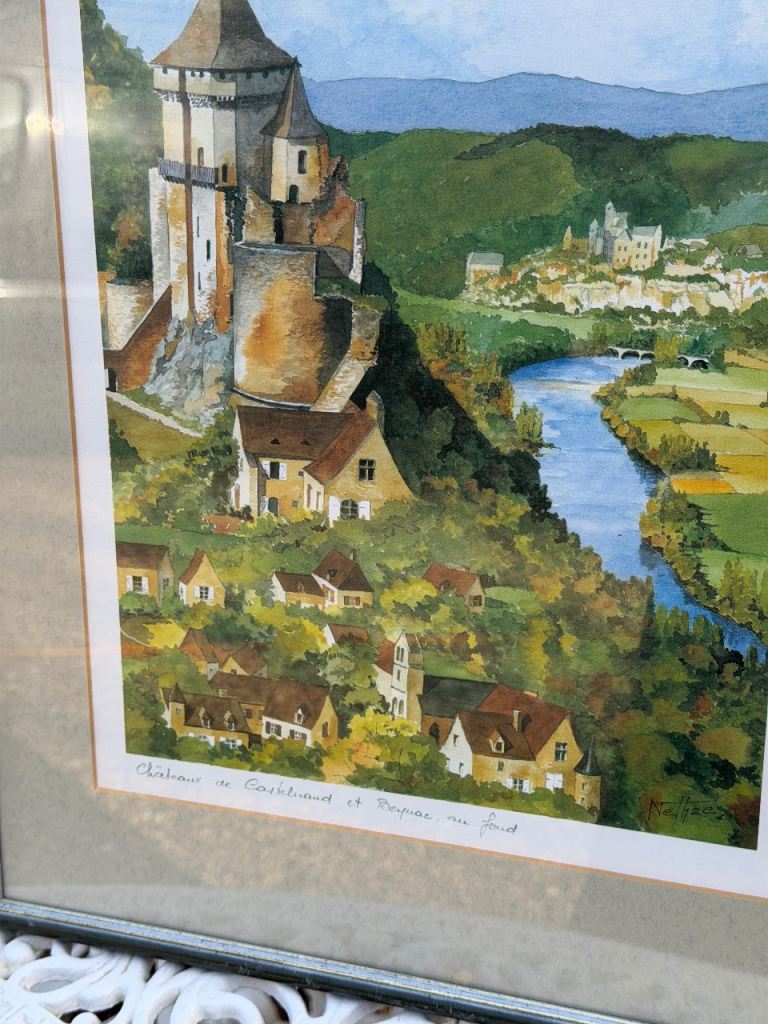 Framed artwork depicts Château de Castelnaud and Beynac in the Dordogne region of France.