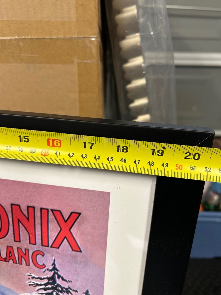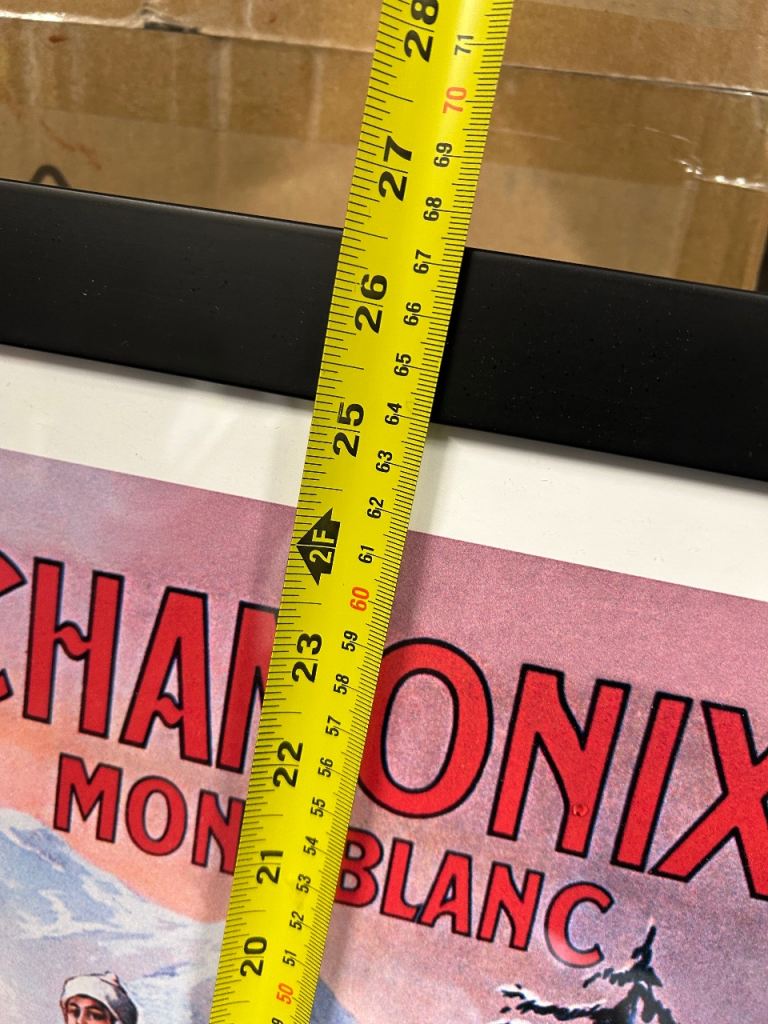 Lovely framed ski poster of Chamonix Mont-Blanc, showing skiers and classic alpine scenery.