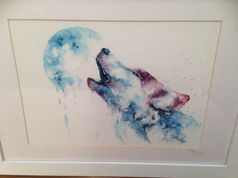 Framed watercolour print howling wolf dog