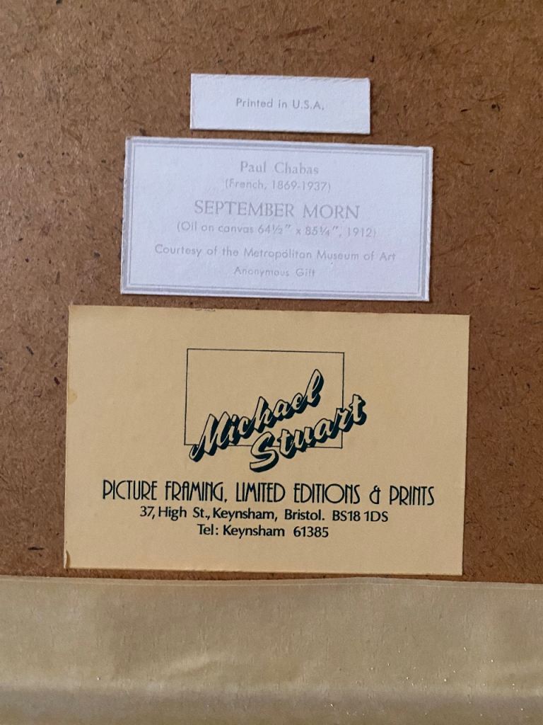 For sale is this lovely framed print of a painting by Paul Chabas entitled September Morn.