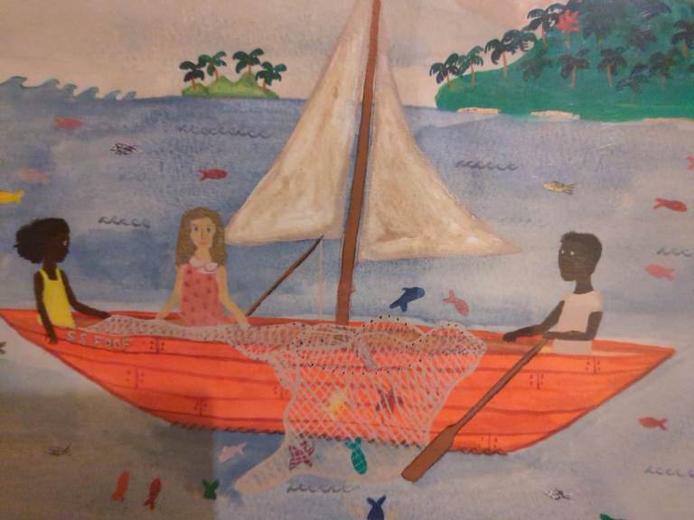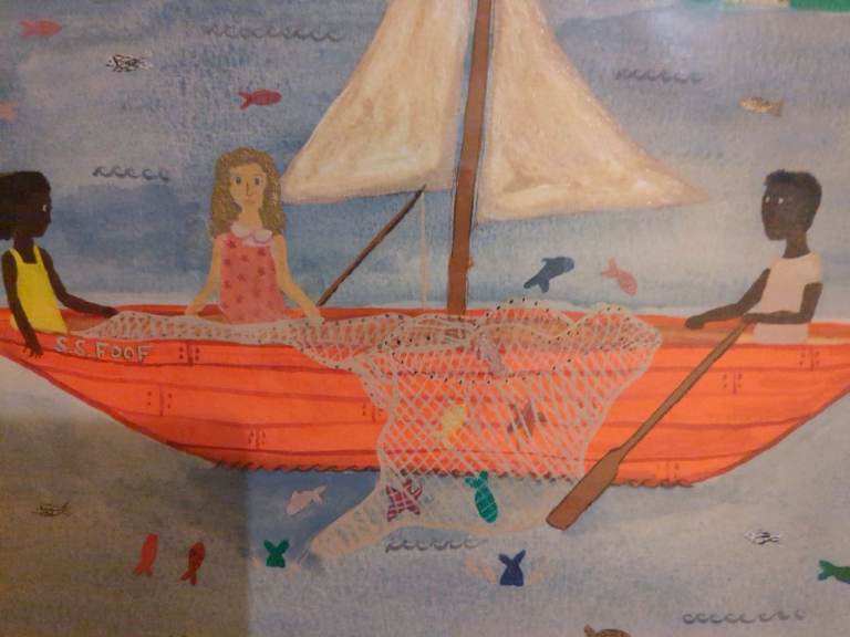 Original watercolour painting depicting a fishing boat with three figures and a net.