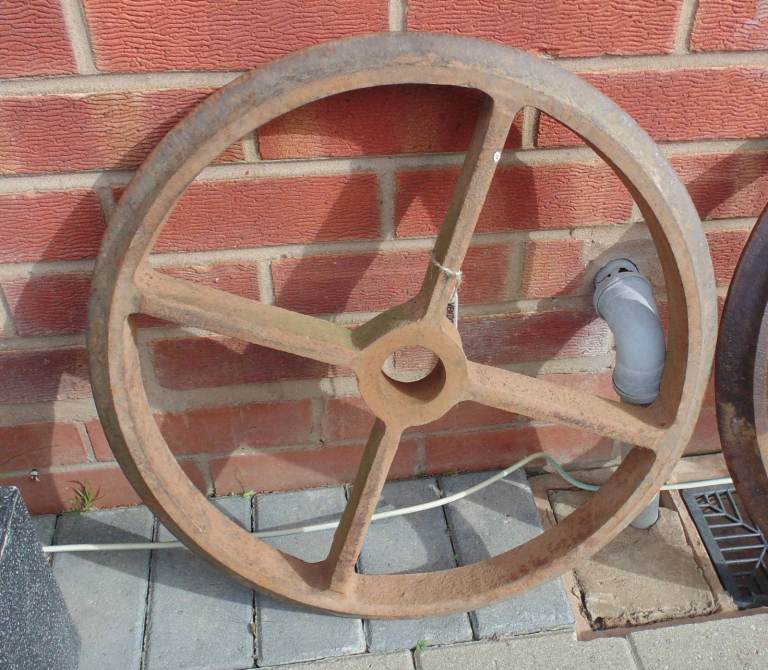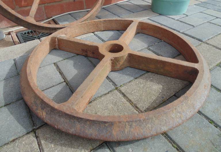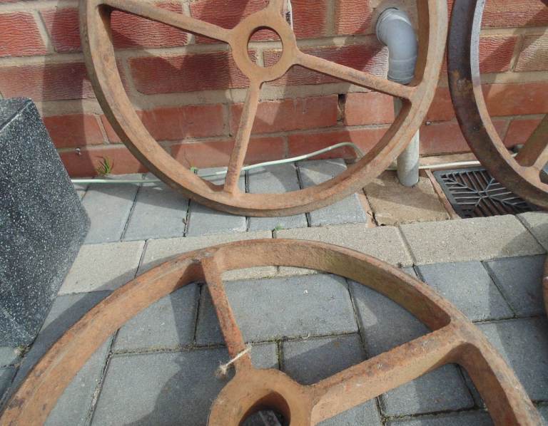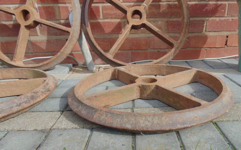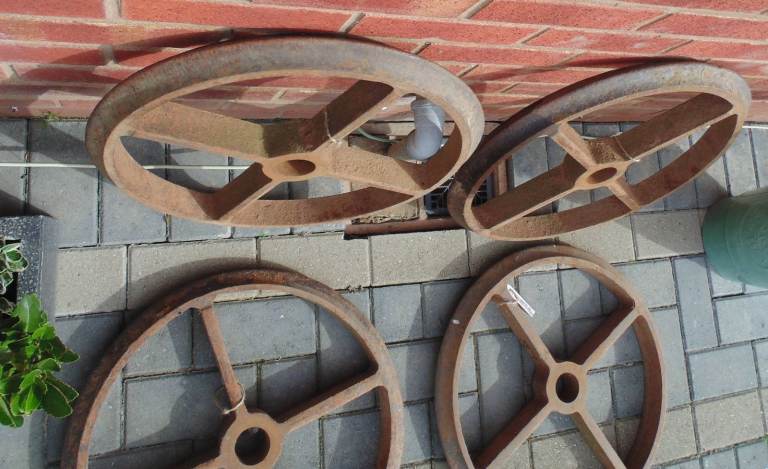 (1310) 4x old cast iron cart truck wheels ideal for garden (Pick up only, Dy4 area)