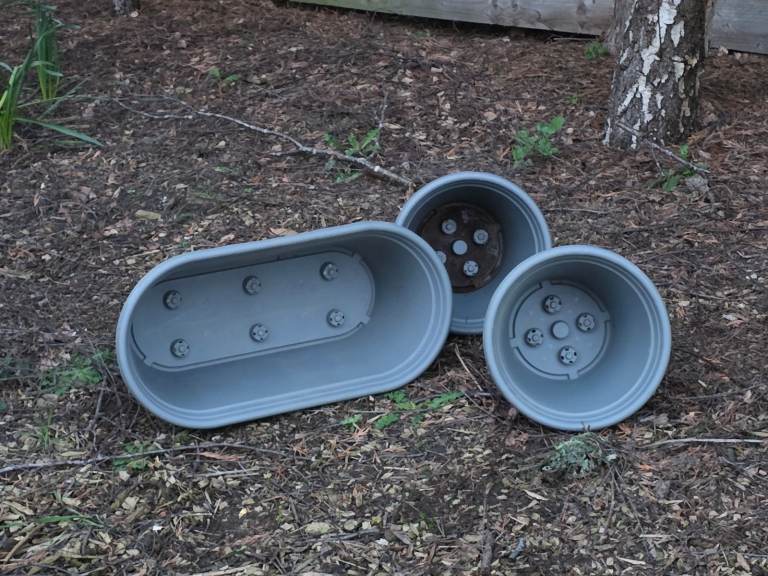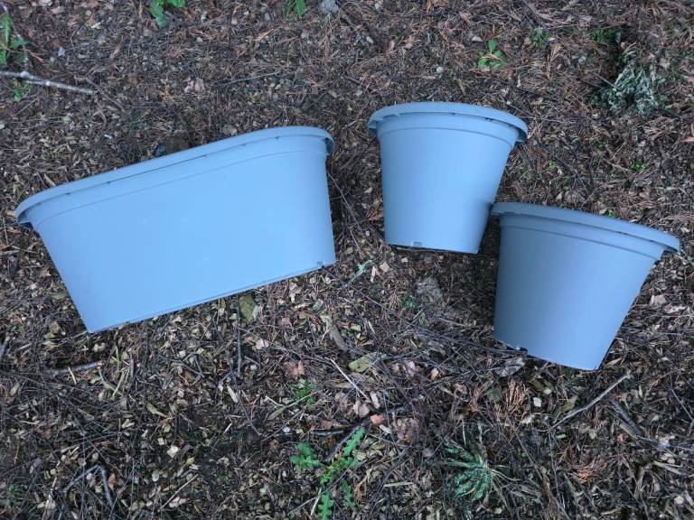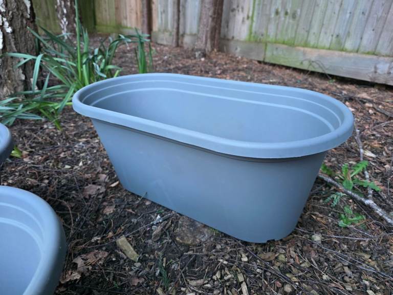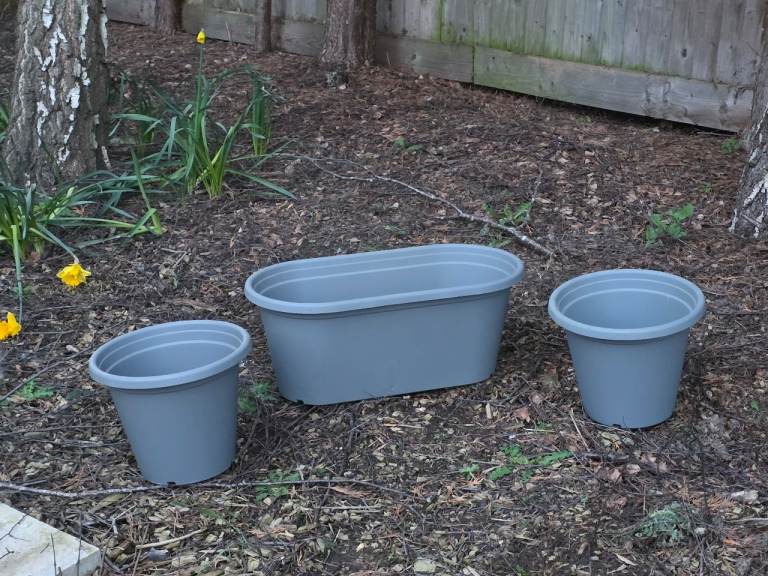 Light grey garden flower planters with water reservoir, brand Clever Pots (from Wilko).