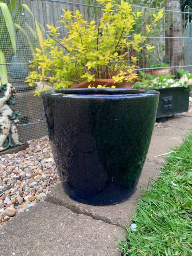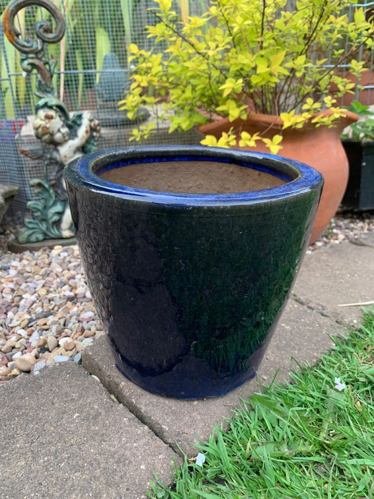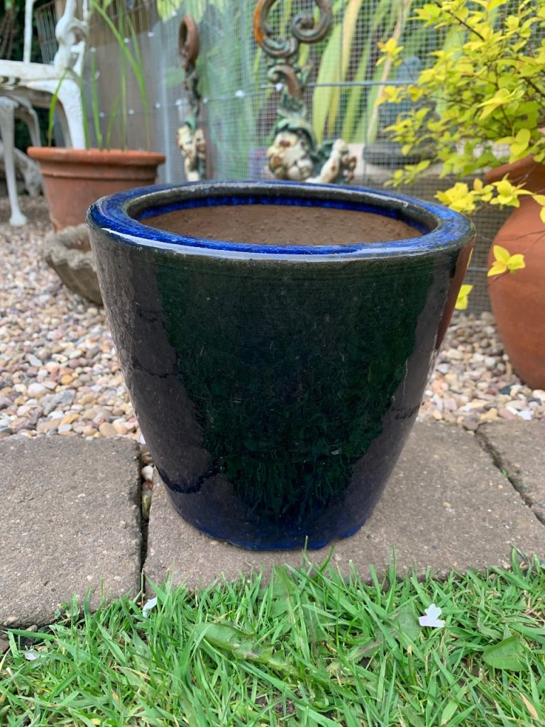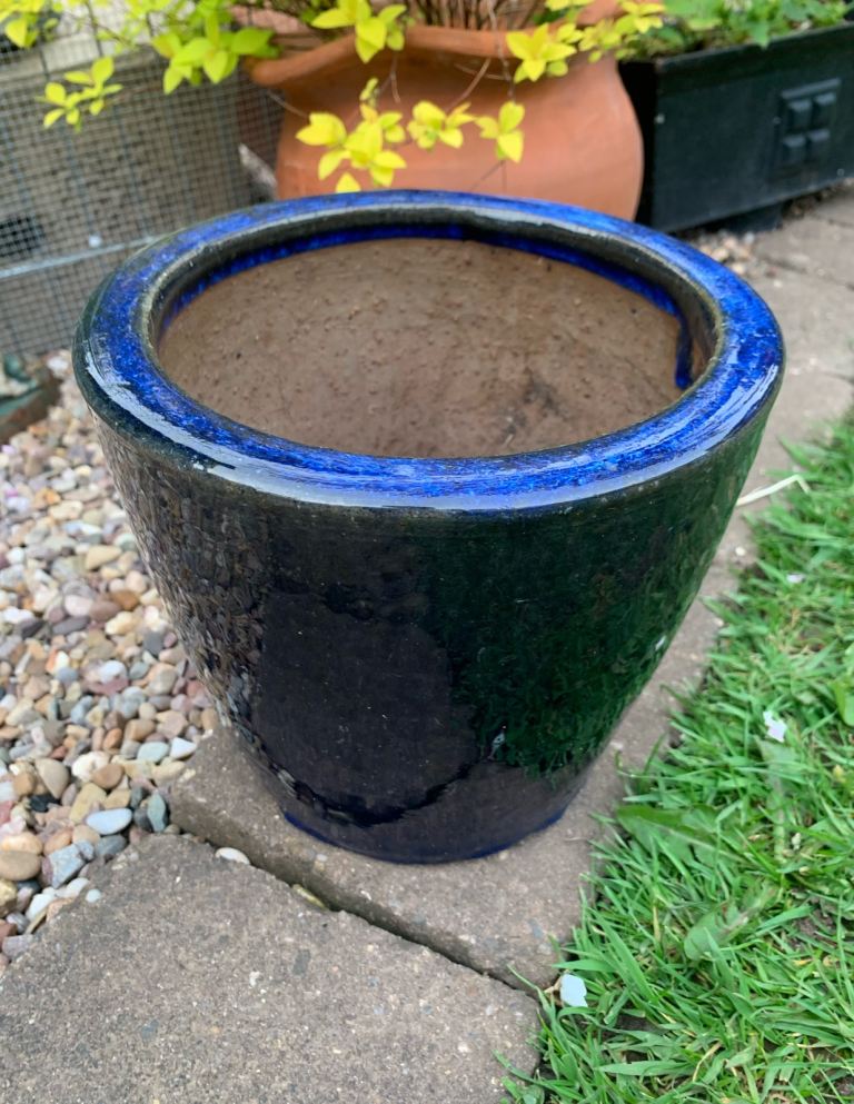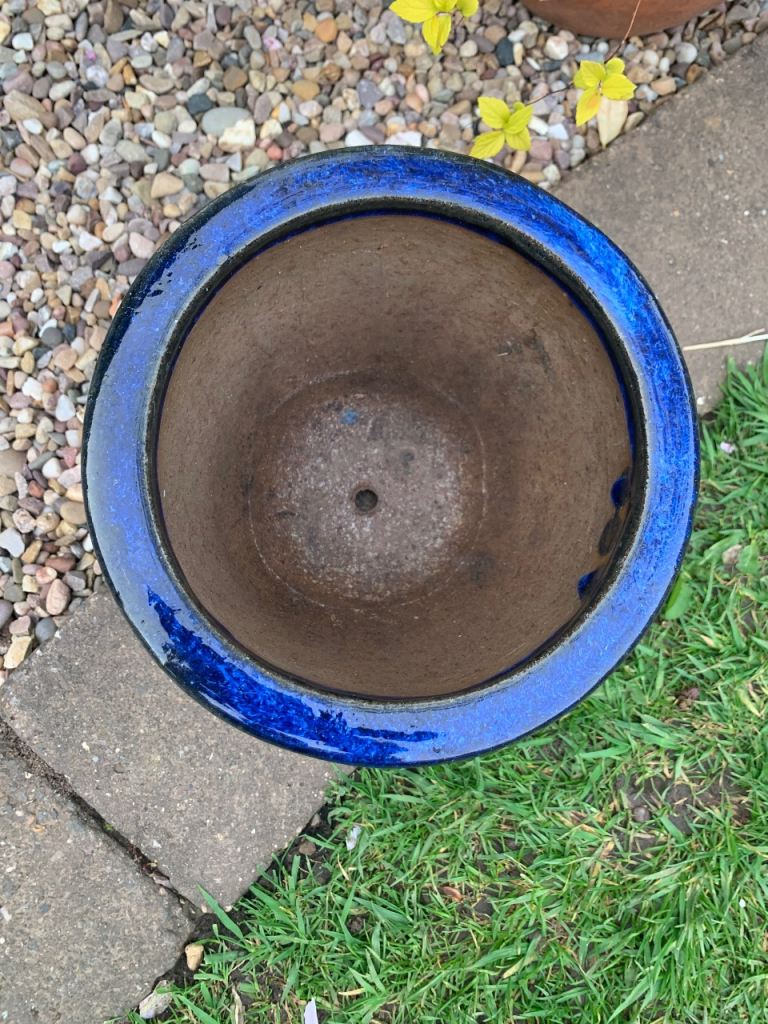 Blue glazed, frost resistant, drainage in base, goood condition & colour