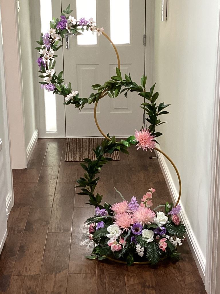 Metal frame for floral decoration. Stands approximately 120 cm x 50 cm.