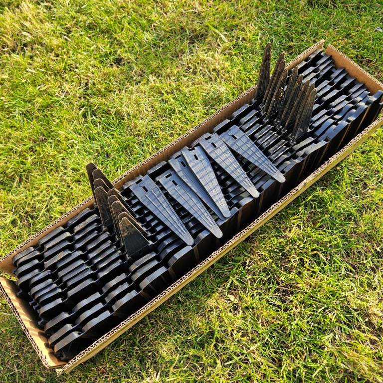Anthracite plastic garden edging. Never used. Picture one just to demonstrate. 12.5 high 228cm long per pack. 6 packs , 3 unopened. 1368cm available in total length available.