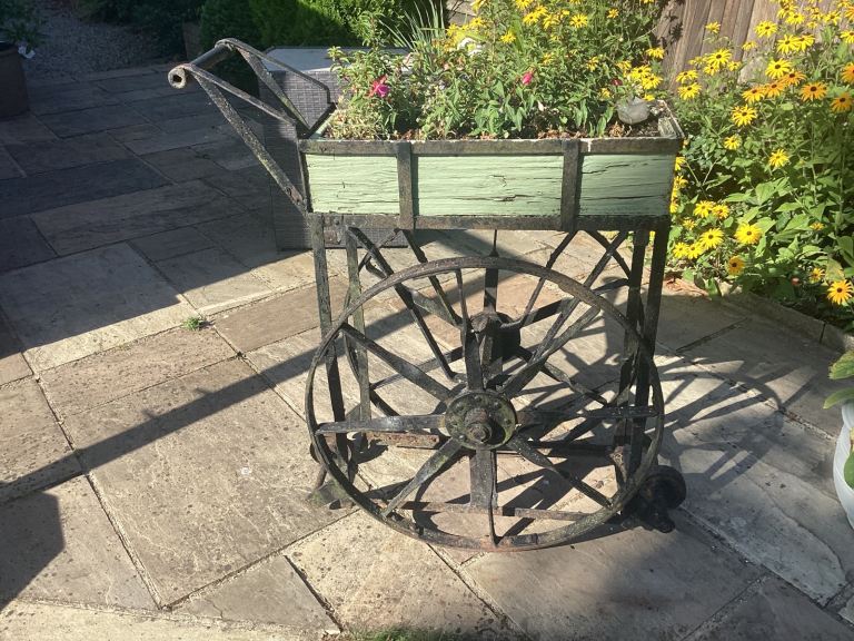 A garden ornament very old rust on bottom of one side wheels need real easing its heavy but looks nice with bedding plants in
