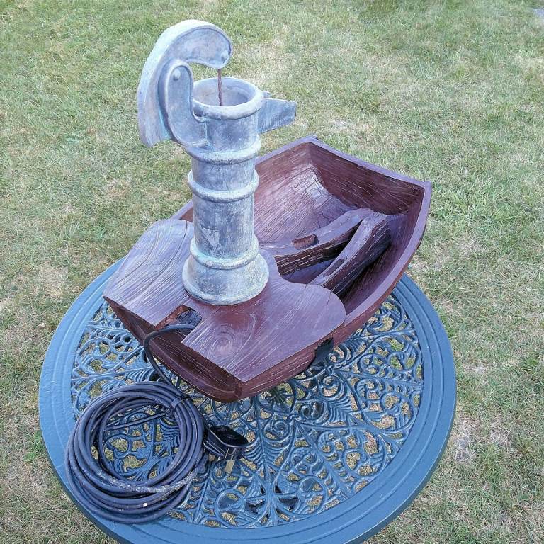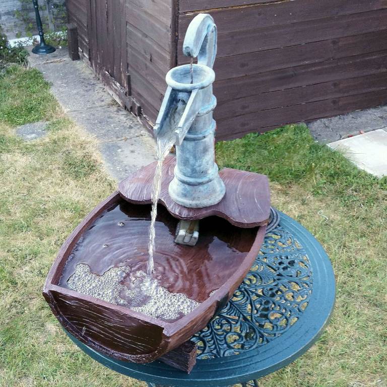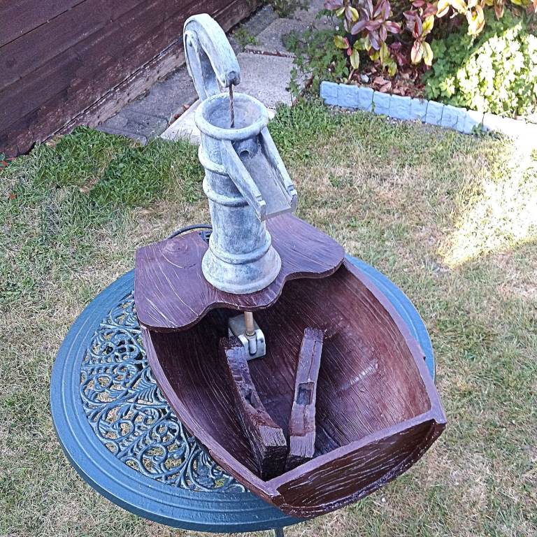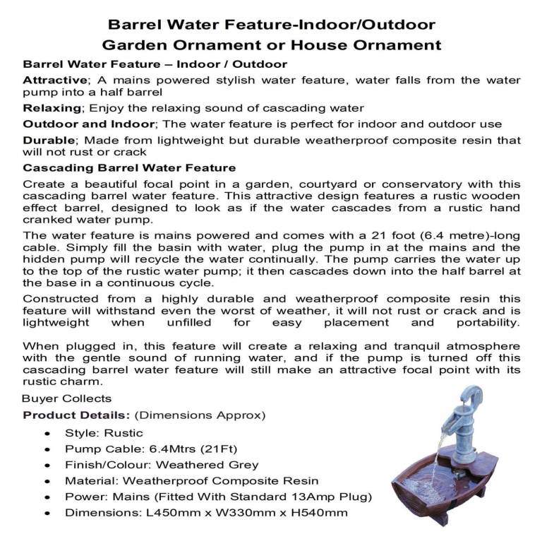 Attractive; A mains powered stylish water feature, water falls from the water pump into a half barrel