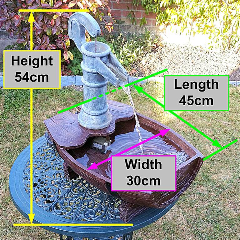 The water feature is mains powered and comes with a 21 foot (6.4 metre)-long cable. Simply fill the basin with water, plug the pump in at the mains and the hidden pump will recycle the water continually. The pump carries the water up to the top of the rustic water pump; it then cascades down into the half barrel at the base in a continuous cycle.