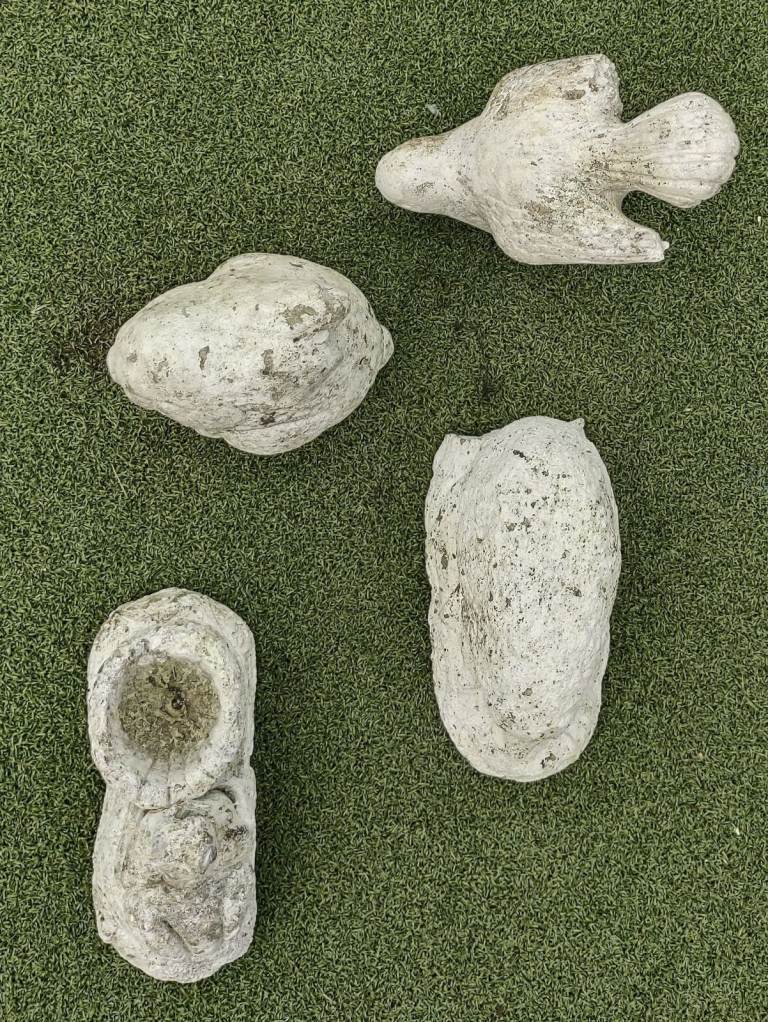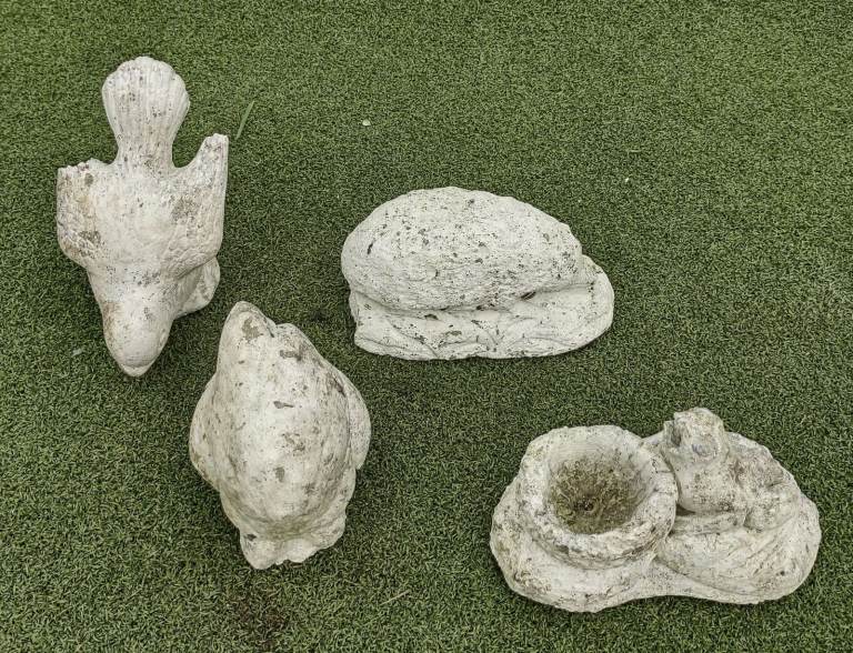 Group of 4 small beautifully weathered vintage reconstituted stone garden ornaments