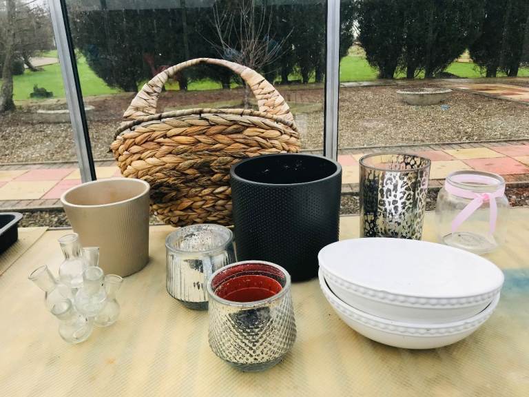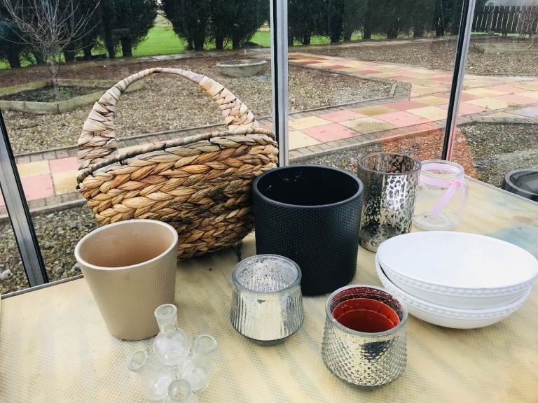 JOB LOT OF PLANT POTS X6, WALL HANGING BASKET & 2 CERAMIC BOWLS
