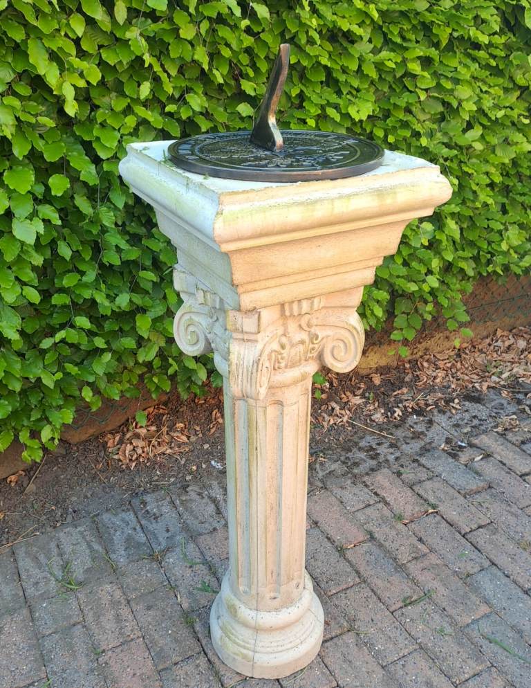 Large approximately 110 cm tall stone sundial with 30 cm diameter dial