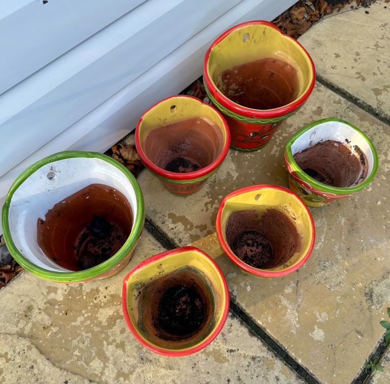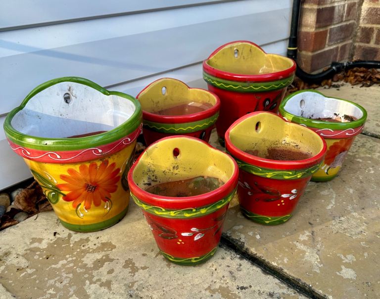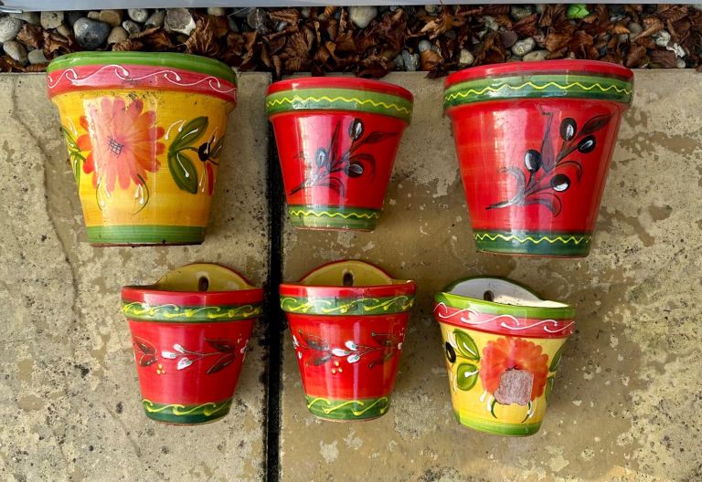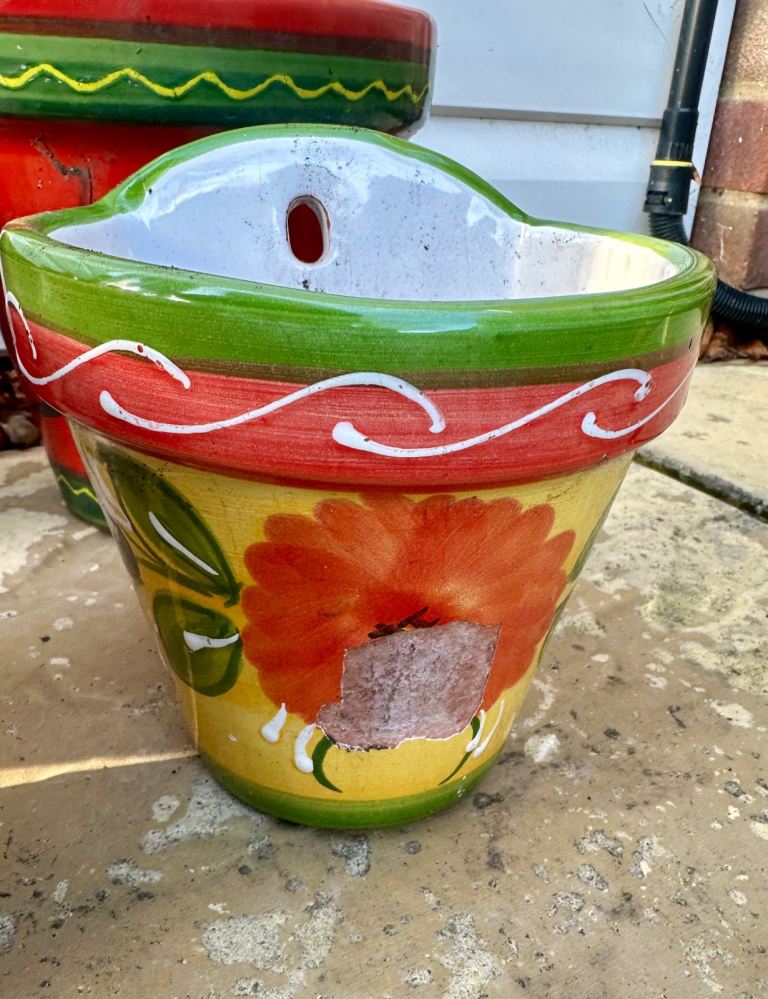Set of 5 Mediterranean hanging stoneware colourful hand painted plant pots, 2 large, 3 small and 1 free due to chip to front.
