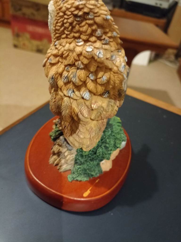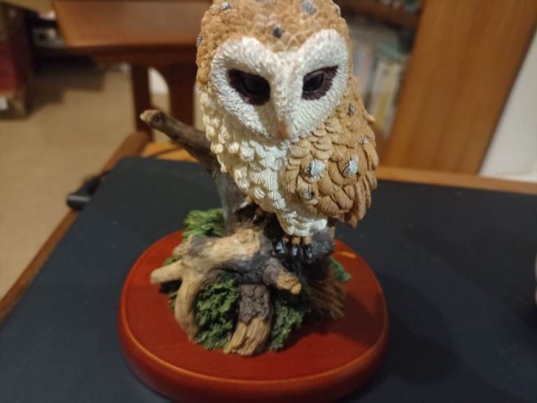 A nice study of an Owl on wooden stand.The piece is unmarked but does have good weight.There is a slight scratch on the wood at the back which should polish out.