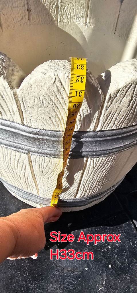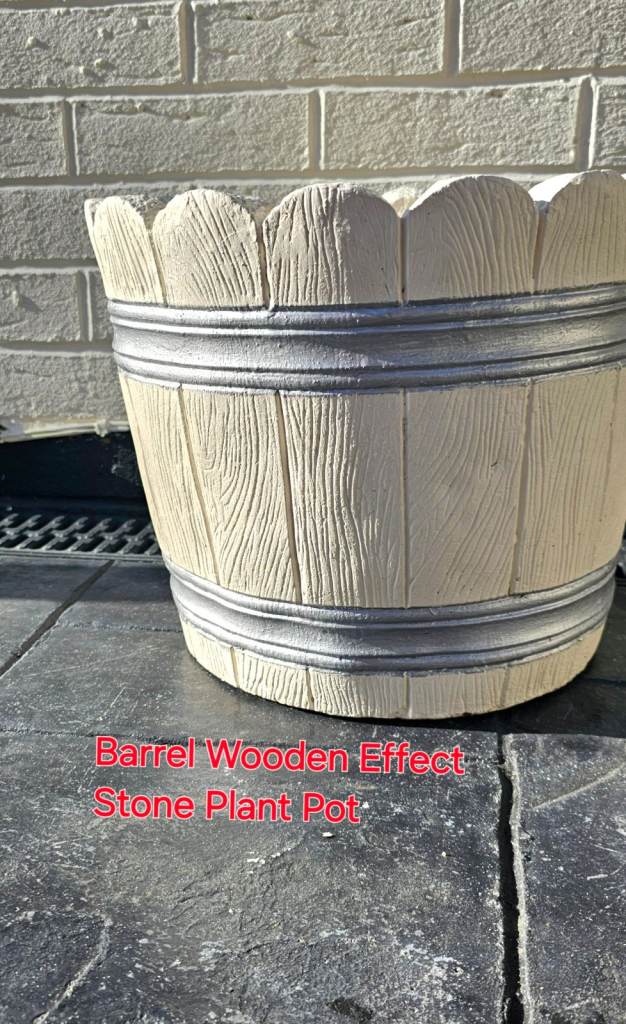 Garden Medium Stone Plant Pot Wooden Barrel Effect Pattern Cream Silver Heavy